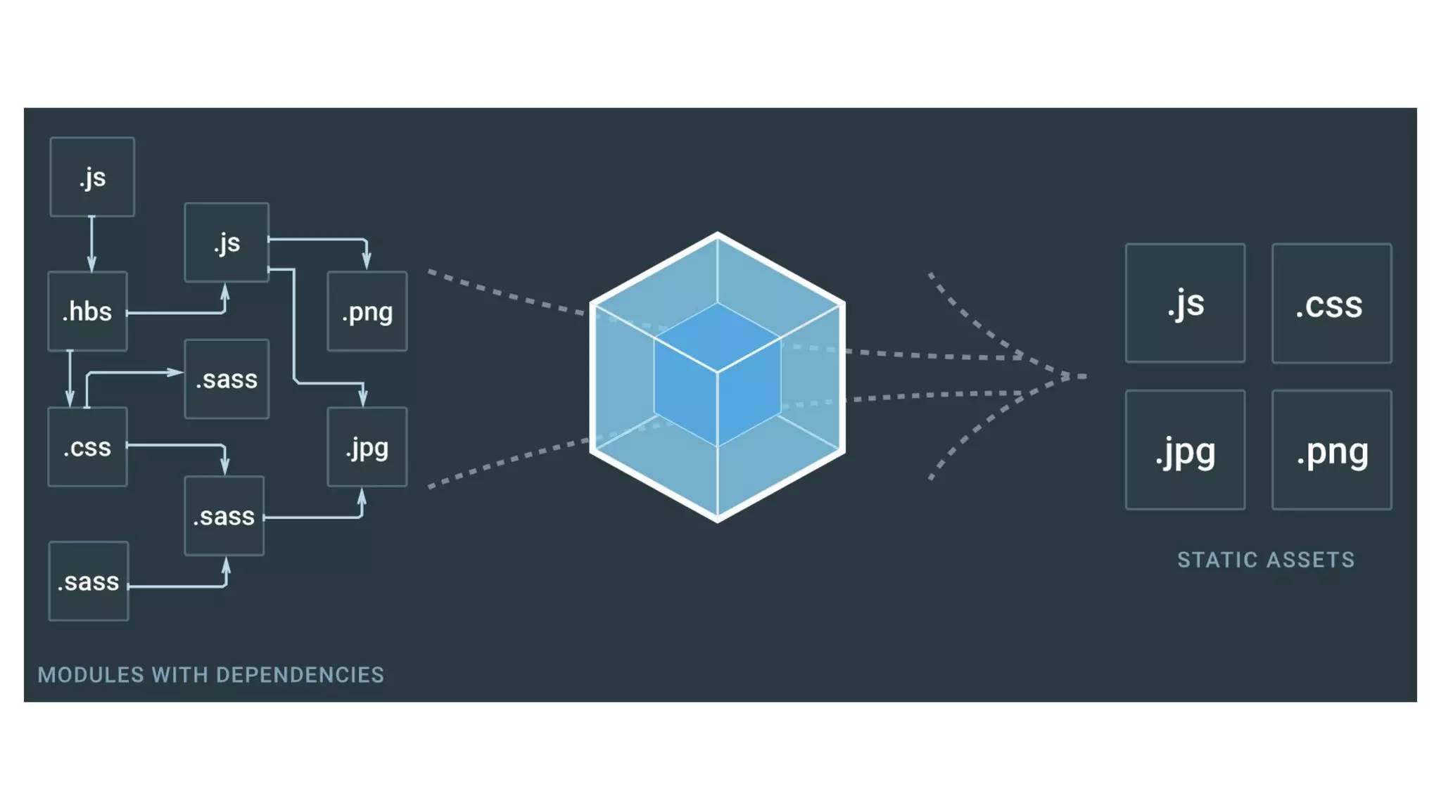 - Webpack is a module bundler that builds dependencies between modules and manages assets like JavaScript files, CSS files, and images.