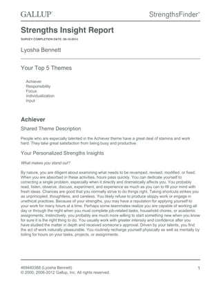 Lyosha Bennett completed a strengths survey that identified their top 5 themes: Achiever, Responsibility, Focus, Individualization, and Input. The document provides personalized insights for each theme describing how they are likely expressed through Lyosha's behaviors and drive to work hard, fulfill obligations, set goals, recognize individual qualities in people, and gather information.