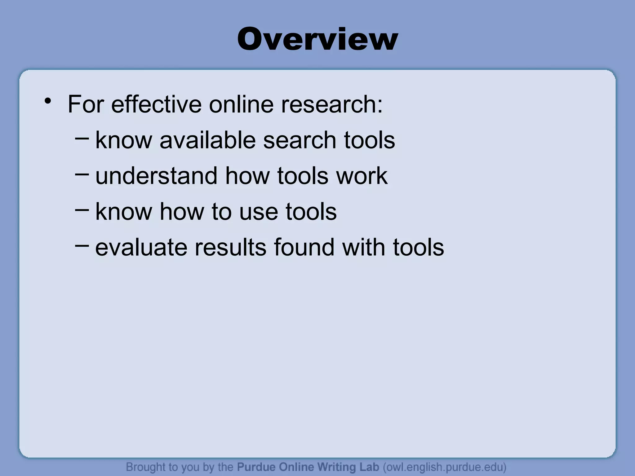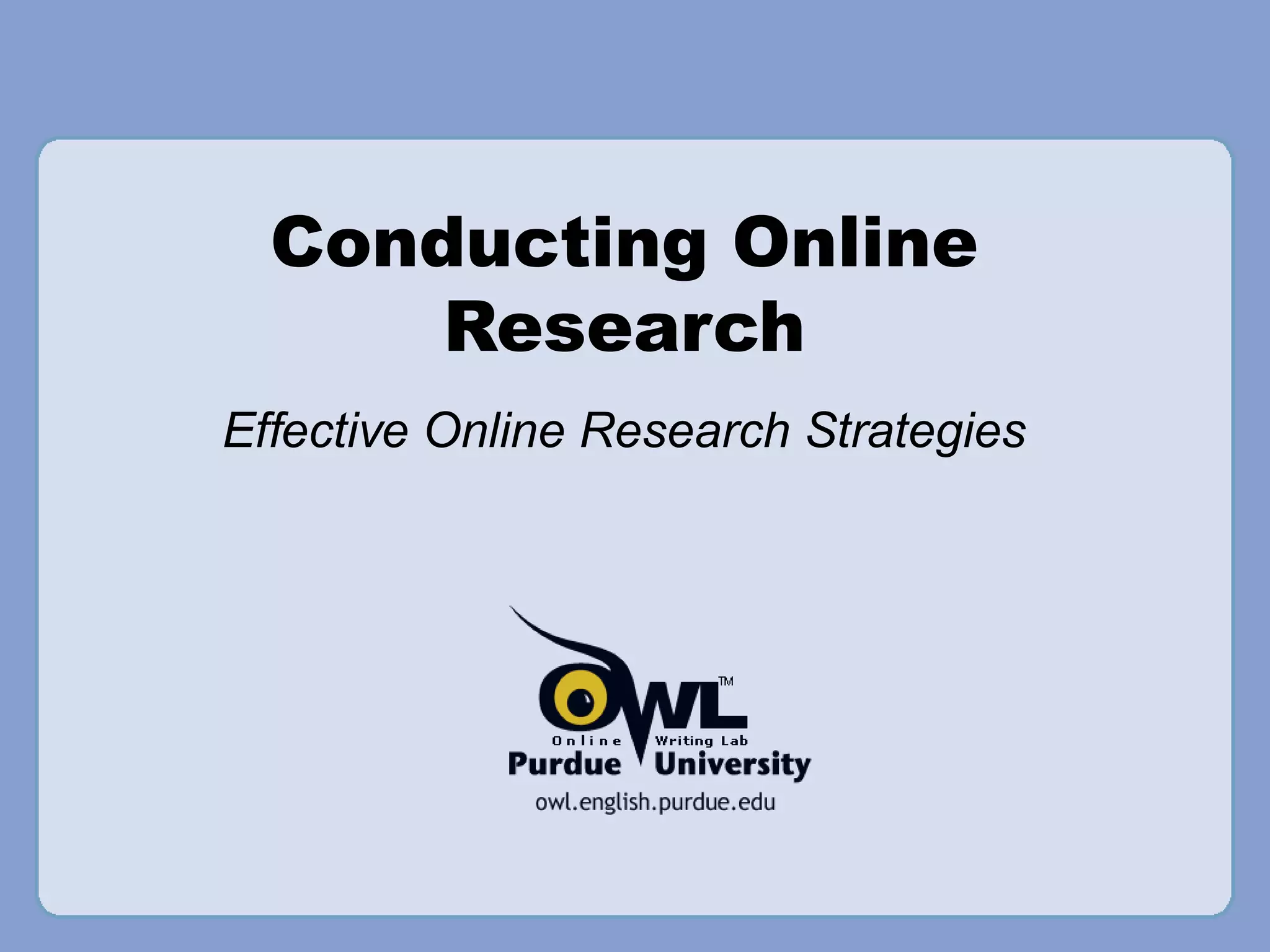 Effective online research requires knowing available search tools, understanding how they work, and being able to use them to evaluate results. The internet contains large amounts of easily accessible information but not everything and results can be frustrating. Anyone can publish online so web sources may lack author qualifications and biases while print is more regulated. Search engines use keywords to return sponsored and algorithmic results about page content and links. General search engines only access the visible web while specialized tools reach the invisible web. Boolean operators and quotation marks allow refining searches. Sources must be evaluated for purpose, authority, currency, and corroboration to determine reliability for a research need.