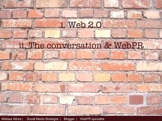 The document discusses the evolution of Web 2.0 and how it has enabled greater collaboration, information sharing, and user-generated content online. It emphasizes the importance of listening to online conversations and engaging with consumers on social media and blogs. It provides examples like Dell's "Dell Hell" blog that sparked widespread discussion. It also stresses that brands must be transparent online and build real relationships through social media to have positive online conversations and reputation management.