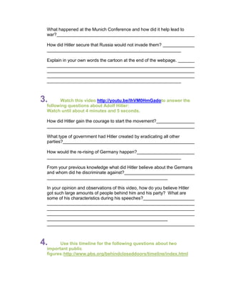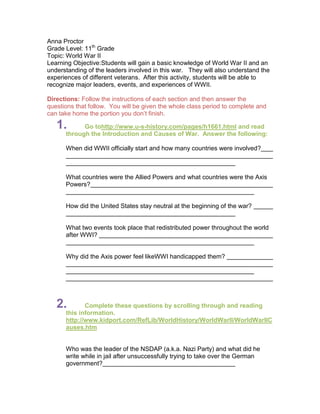 The document provides an assignment for an 11th grade World War II class. It includes 11 sections for students to complete involving reading passages, watching videos, and answering questions to gain understanding of key WWII concepts. The sections cover causes of the war; leaders like Hitler and Churchill; major battles in Europe and the Pacific; concentration camps and the Holocaust; and veteran interviews. The goal is for students to recognize major leaders, events, and experiences of WWII and understand the perspectives of different veterans.