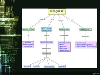 This document discusses webquests, which are educational activities designed around using websites to research a topic. It notes that webquests were developed in 1995 at San Diego State University by Tom March and Bernie Dodge as a way to structure student research on the web. The document outlines the cognitive learning approach of webquests and provides steps for creating a webquest, including defining a topic, outlining tasks, locating websites, and assessing student understanding. It also includes several examples of existing webquests.