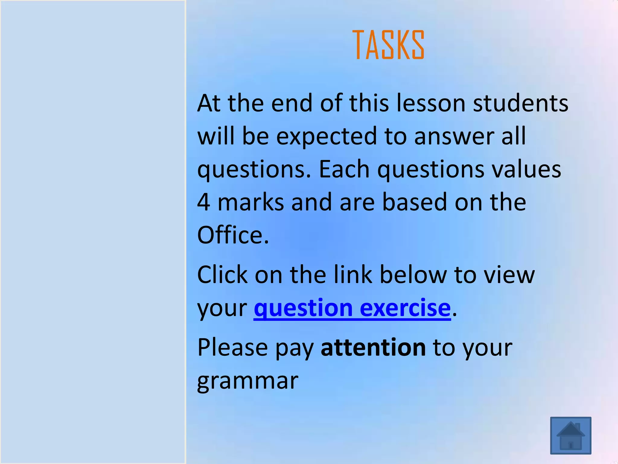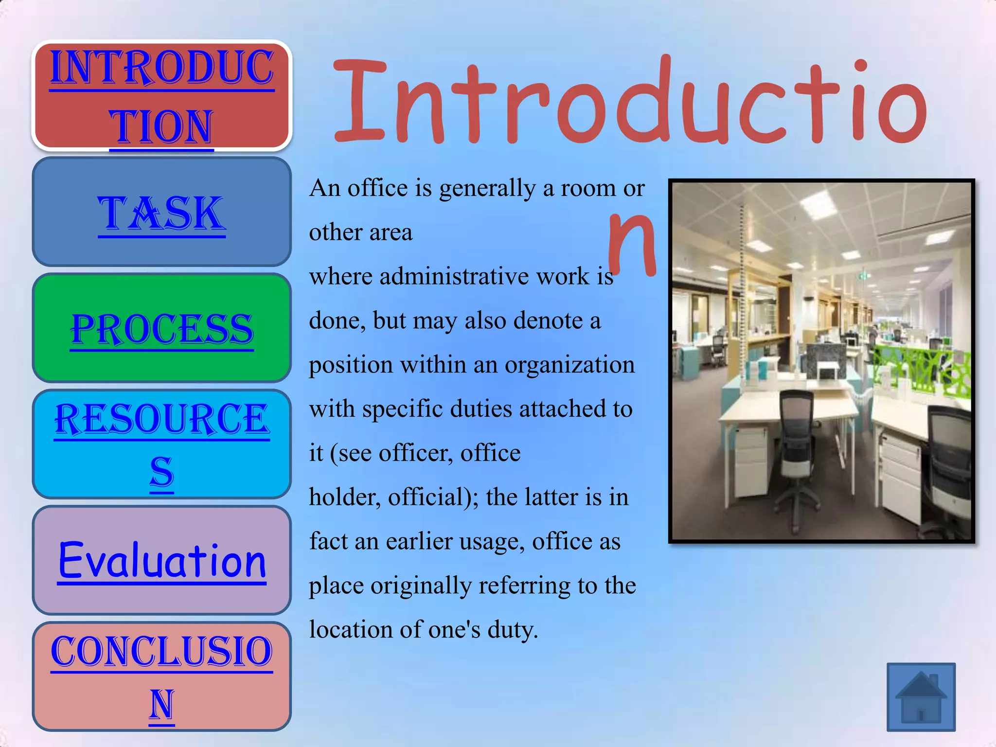 The document discusses the layouts, equipment, tasks, processes, and evaluation of an office. It describes two types of office layouts - open-plan and enclosed - and lists advantages and disadvantages of each. Students are asked to complete a task answering questions about office layouts and equipment, and their responses will be evaluated on grammar and quality of answers.