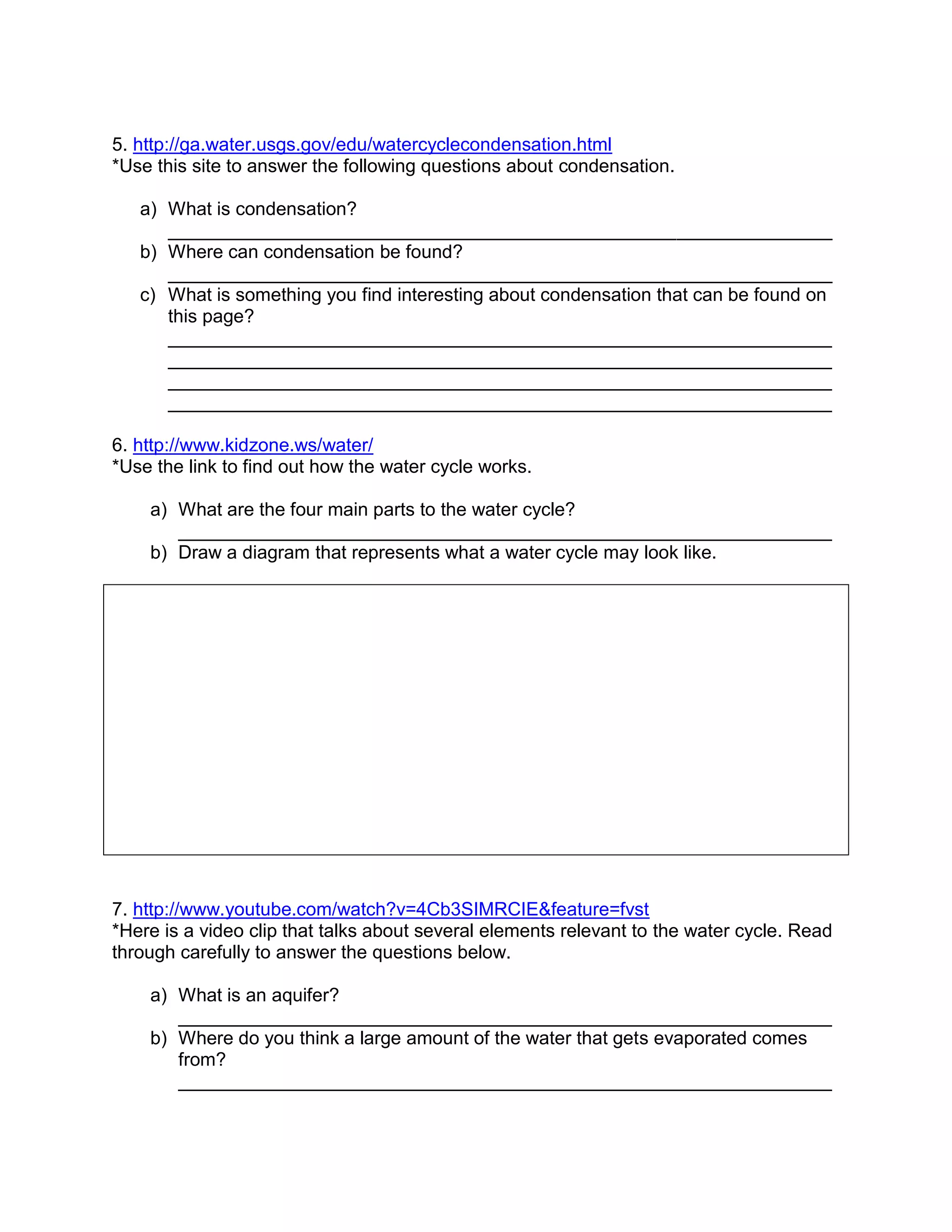 The document is a lesson plan for a 4th grade science class on the water cycle. It includes 10 sections with links to online resources and questions for students to answer. The questions cover topics like the states of water, aquatic biomes, evaporation, condensation, precipitation, aquifers, cloud formation, and statistics from NASA on the water present on Earth and in the oceans. The lesson aims to teach students about how water moves and changes forms between oceans, air, land, and underground as it circulates through the water cycle.