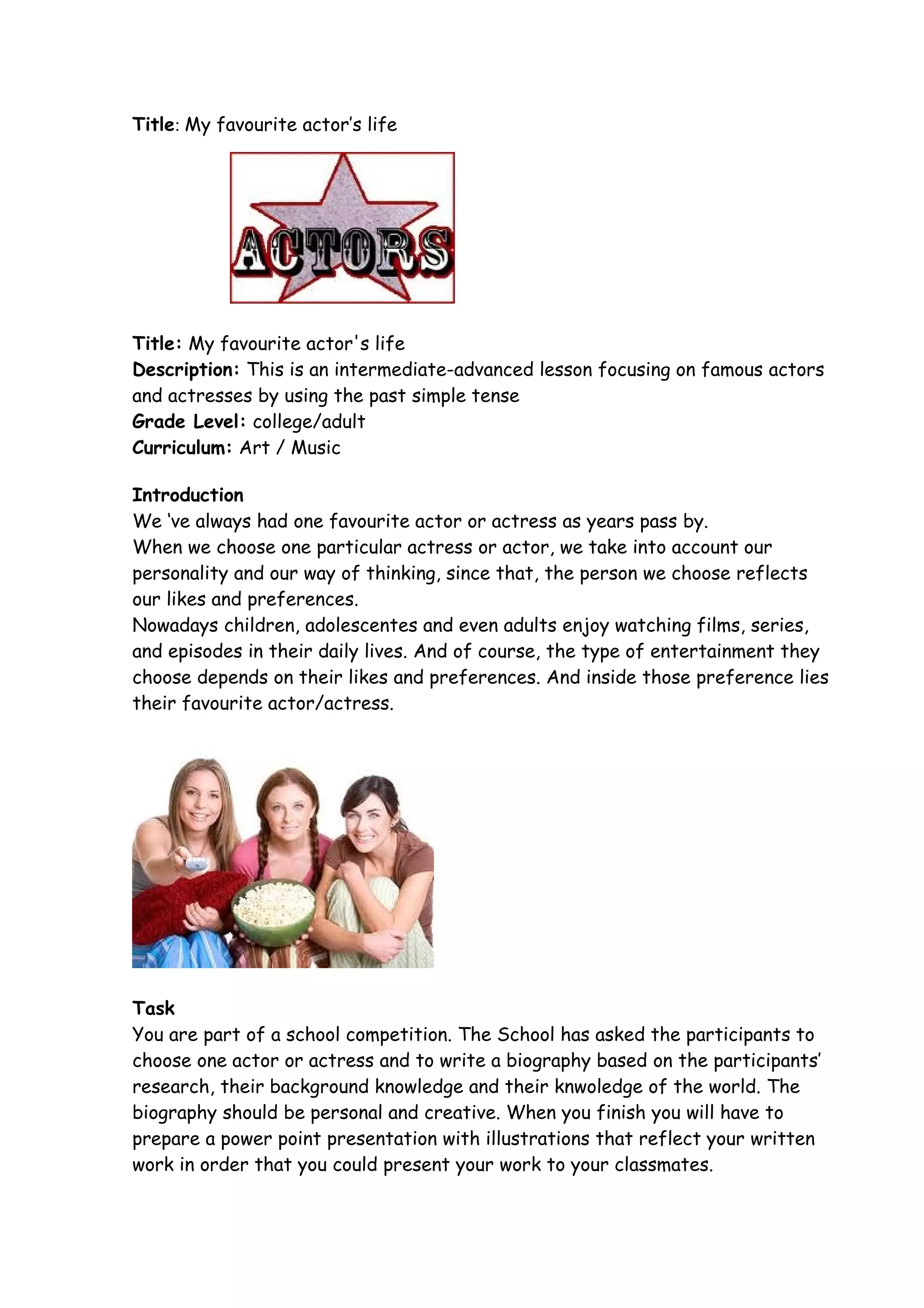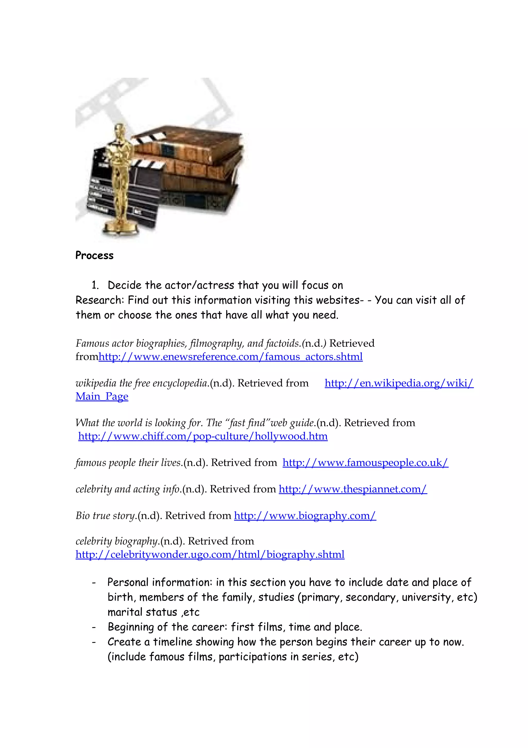 This document provides instructions for an assignment where students must research and write a biography about their favorite actor or actress. Students are asked to choose a subject, research their life and career using provided websites, organize the information collected, write a biography in Word, and create a PowerPoint presentation summarizing the biography. The assignment will be evaluated based on creativity, dedication, language and grammar use, and inclusion of all requested information. The goal is for students to practice research, summary, and presentation skills while learning about famous people.