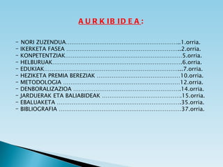 EBALUAKETA IRIZPIDEAK :* Ebaluaketa saio bakoitza bukatu ostean burutuko da, ondorengo irizpideak kontuan izanik. Horretarako ondorengo taula beteko da eta ebaluaketa jarraia egingo da saio guztien bukaeran. Hankaz gora jarritako banku baten gainean oreka mantenduz desplazatzen da. Desplazamenduak era eraginkorrean burutzen ditu. Espalderan zehar desplazatzen da. Espalderak igo eta jaitsi egiten ditu. Bere eskuin-ezkerra, aurrera-atzera joateko gai da. Bere gorputz atalak bereizten ditu. Gora eta behera eta gainetik eta azpitik mugitzeko gai da. Igerilekuan ondo moldatzen da. Jarraitzen du igerilekuko begiralearen aginduak. 35