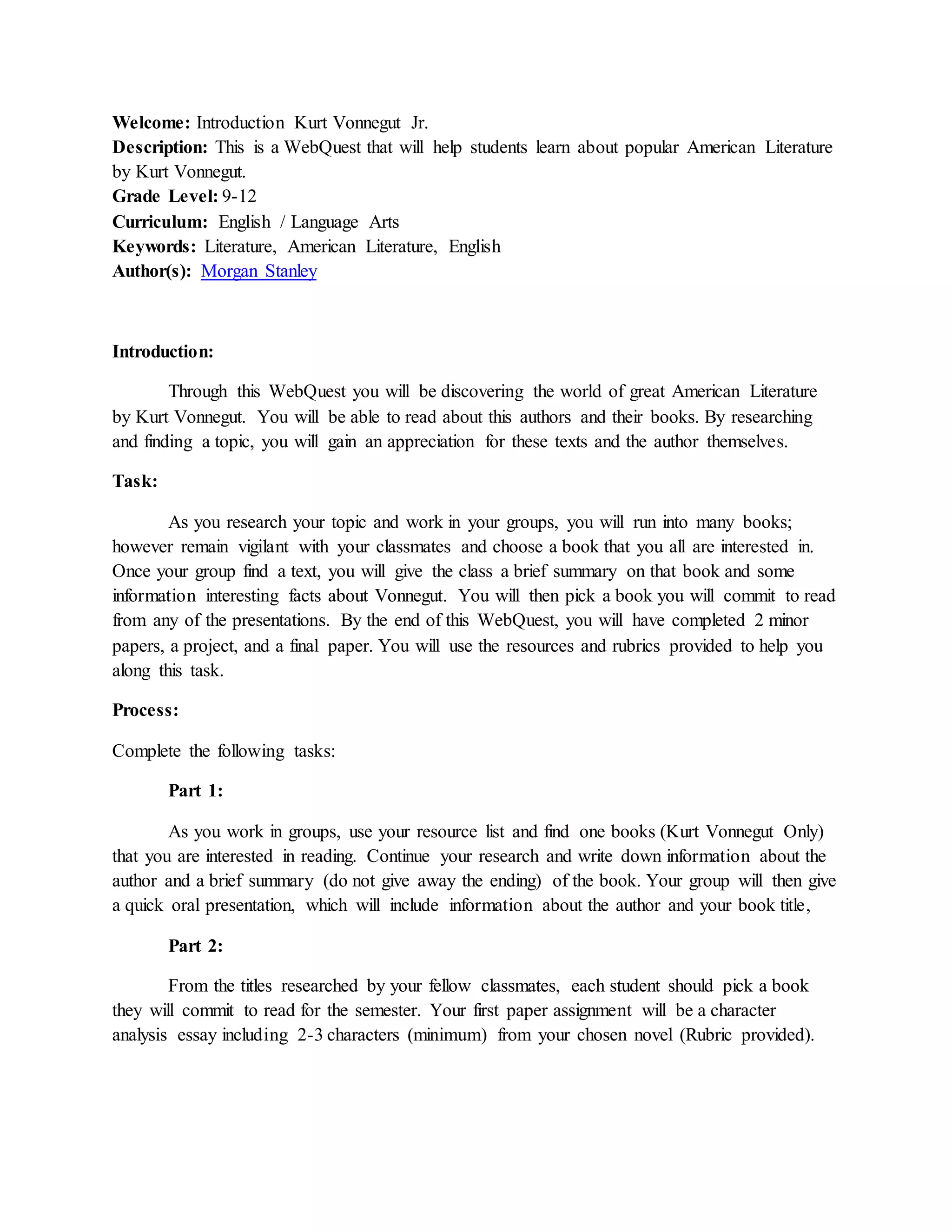 This document provides an introduction to a WebQuest about the American author Kurt Vonnegut. Students will research Vonnegut and one of his books, completing assignments such as a character analysis essay, a creative project advertising their chosen book, and a book review. They will be evaluated using rubrics for each assignment that assess elements like accurate summarization, use of literary terms, and writing quality. The goal is for students to gain appreciation for Vonnegut and his texts.