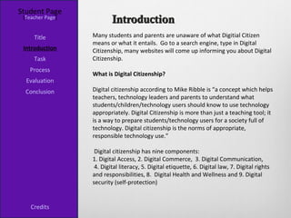 This document provides instructions for a lesson on digital citizenship. The lesson asks students to create a skit explaining one of the nine components of digital citizenship. Students can work individually or in small groups. Their skits should be 3-10 minutes long and focus on explaining a digital citizenship concept in a kid-friendly way. The document provides guidance on researching the topic, developing the skit, and the due date for the project.