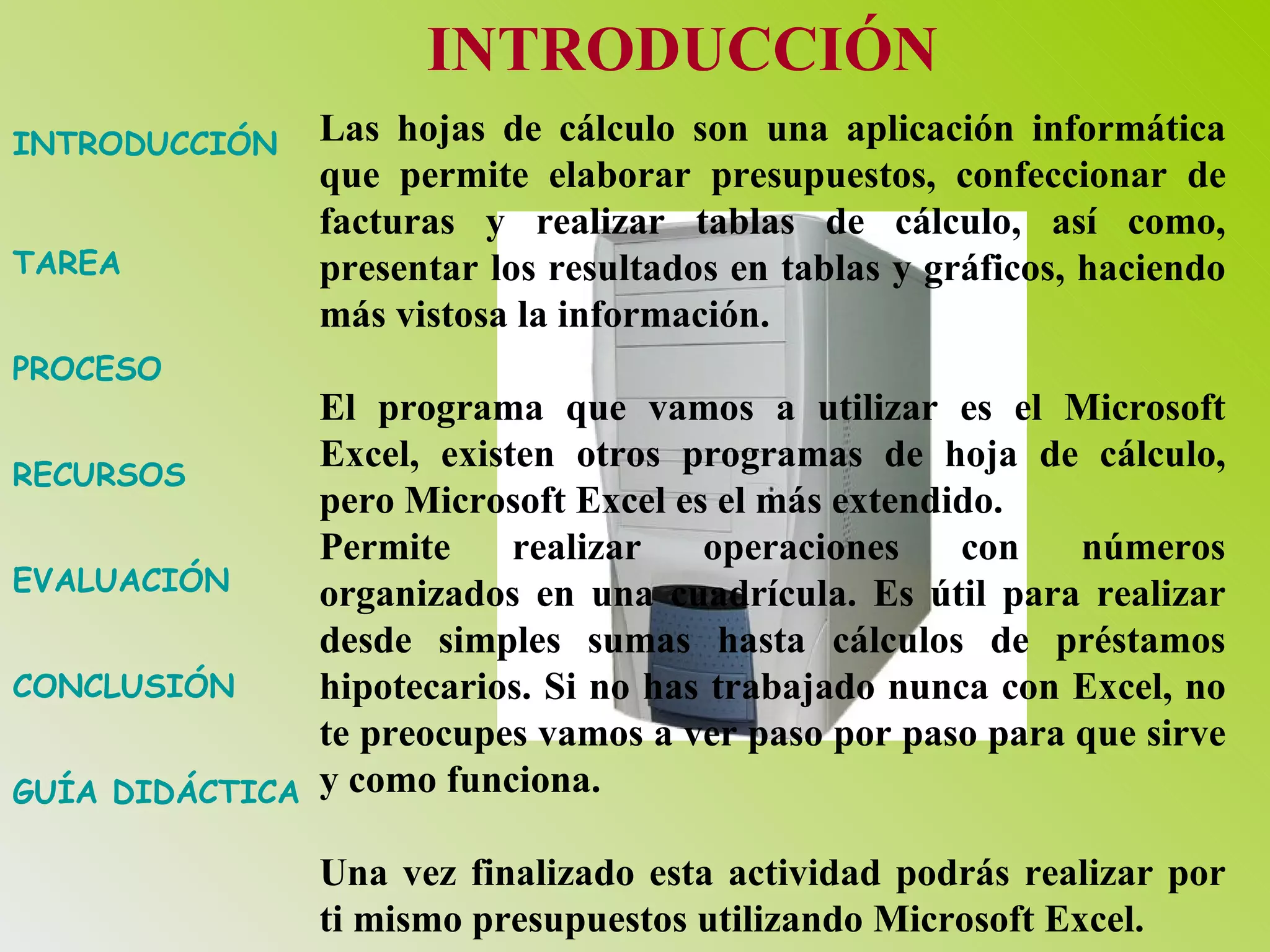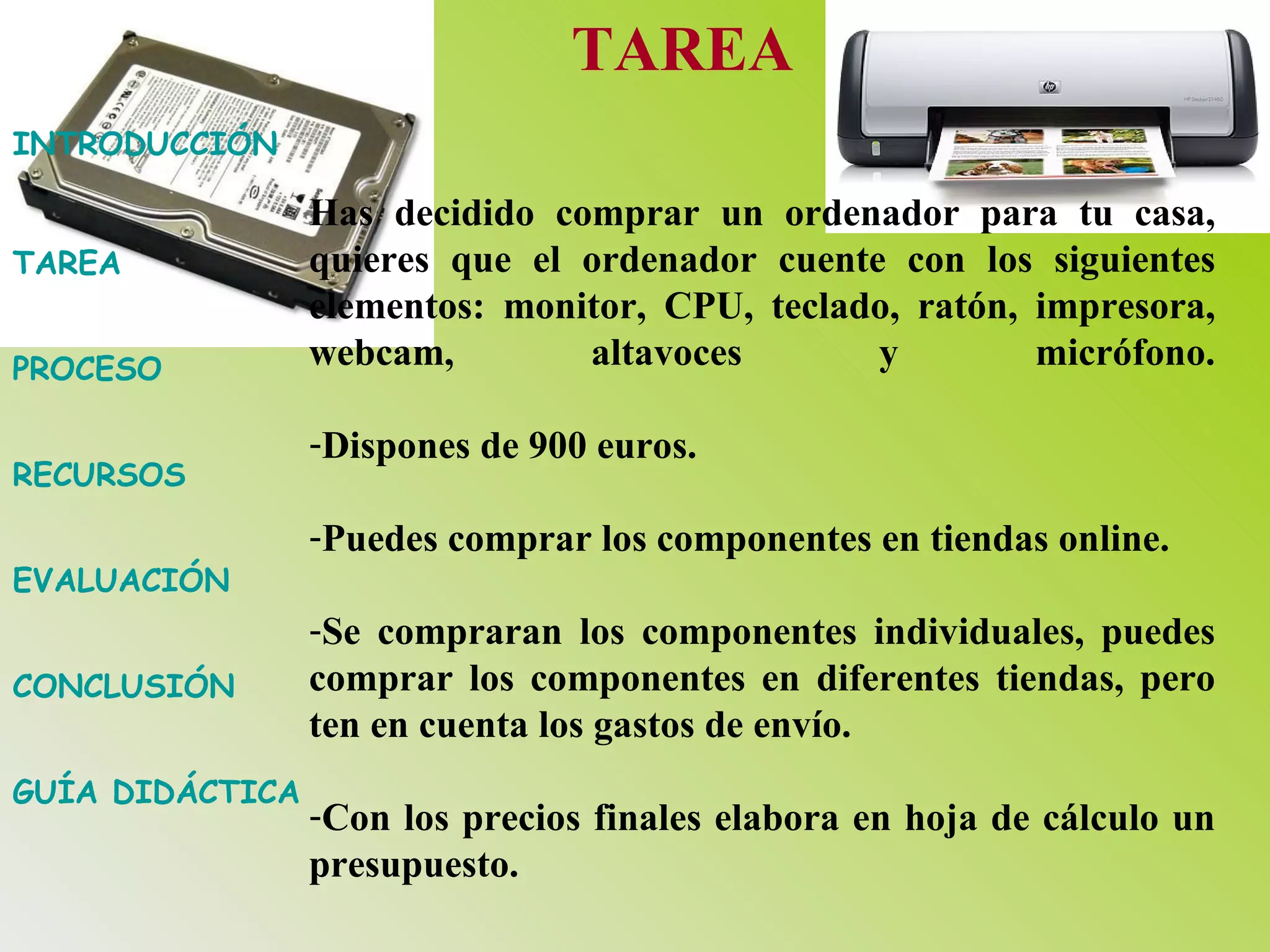 El documento presenta una guía didáctica para que los estudiantes creen un presupuesto para comprar los componentes de un ordenador usando Microsoft Excel. Los estudiantes deben buscar precios en tiendas online, seleccionar los componentes que quepan en un presupuesto de 900 euros, y crear una hoja de cálculo con un presupuesto detallado mostrando los precios de cada elemento y el total. El objetivo es que los estudiantes aprendan a utilizar hojas de cálculo para tareas presupuestarias y financieras.
