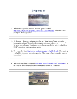 The document discusses the water cycle and its key components. It provides educational resources for students to learn about evaporation, condensation, precipitation, and collection. Students are asked to read about and watch videos explaining each part of the water cycle and answer questions to test their understanding. The goal is for students to grasp how water is recycled through different states as it moves between the atmosphere and Earth.
