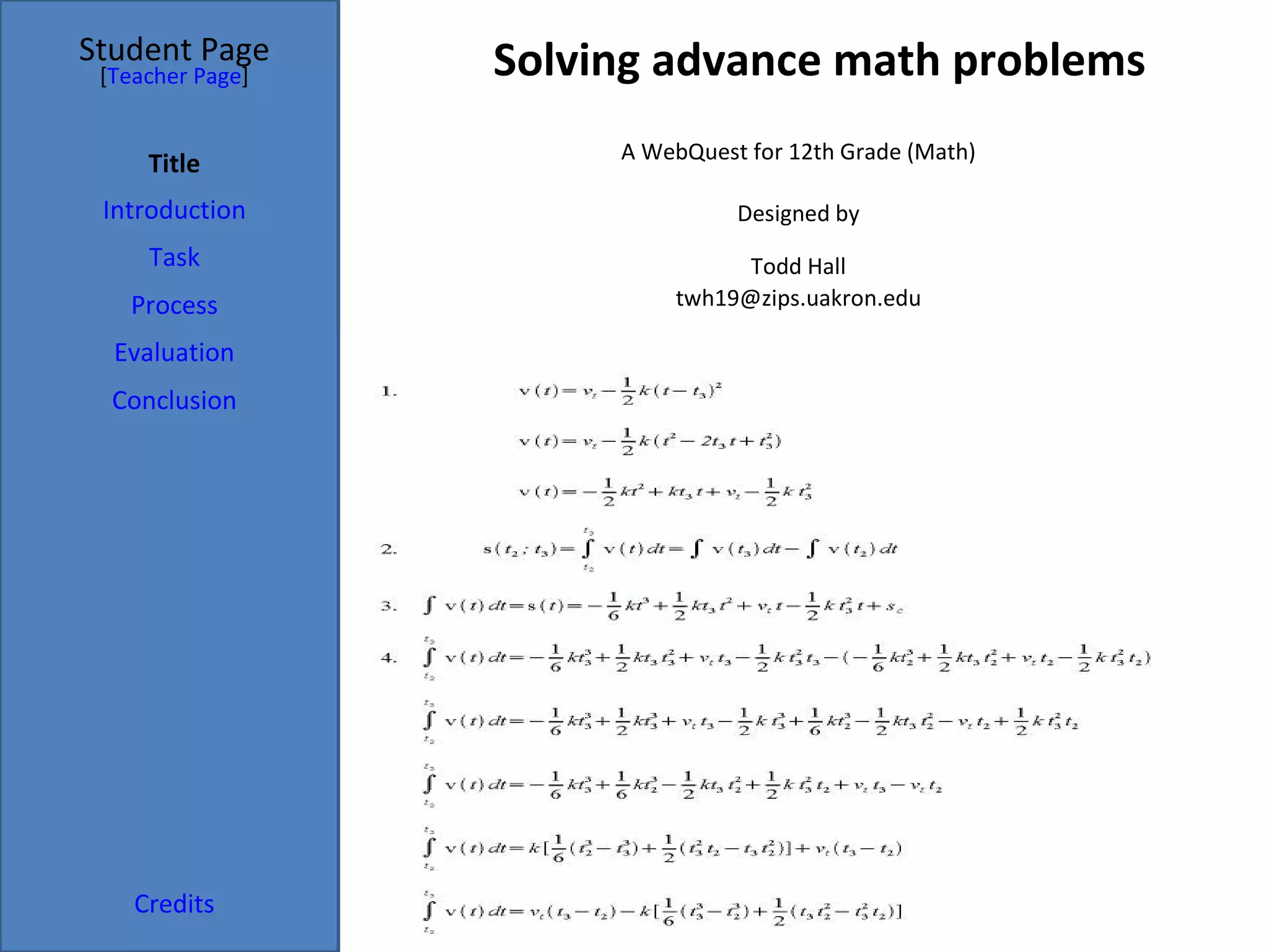 This document provides templates for creating a WebQuest, which is an inquiry-oriented lesson format that uses web links for students to learn. The templates include sections for the student page and teacher page. The student page sections are an introduction, task, process, evaluation, conclusion and credits. The teacher page provides additional context for other teachers, including standards, resources and a facilitation script. The overall goal is for students to solve math problems by accessing online resources and working through the outlined process.