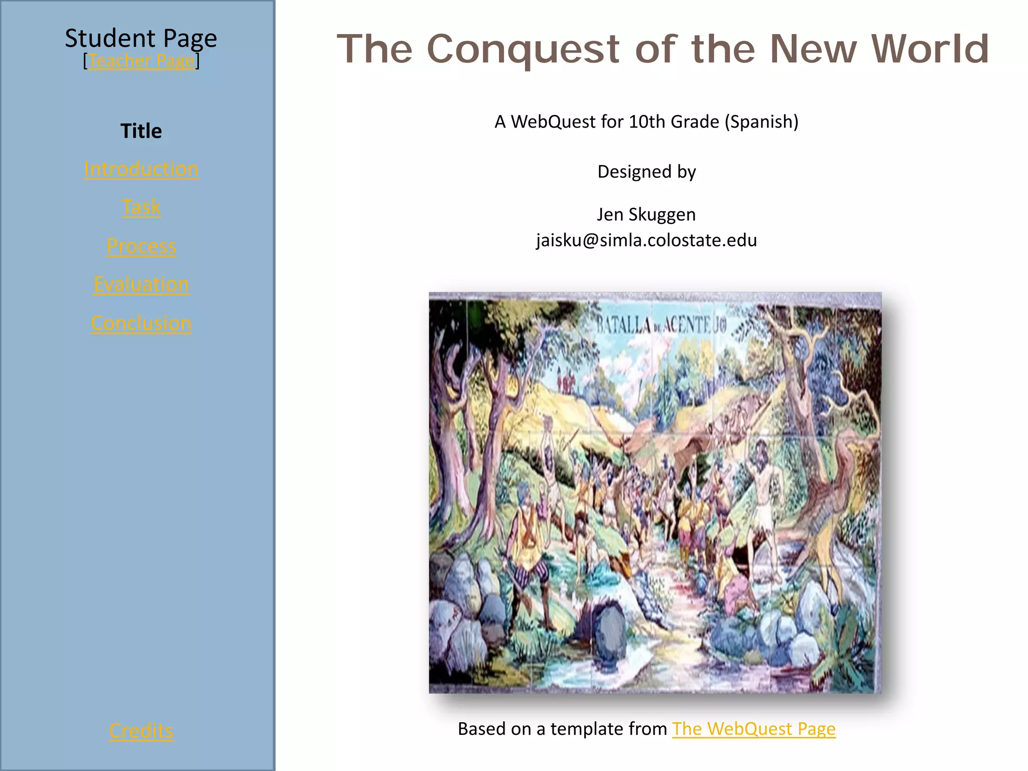This document is a webquest for a 10th grade Spanish class about the Spanish conquest of the New World. It provides background information on Hernan Cortés' voyage across the Atlantic in 1551 under orders from the King of Spain to obtain wealth, claim land, and convert indigenous people to Catholicism. The introduction notes that indigenous peoples in Mexico believed the god Quetzcoatl would return as a butterfly, and they saw Cortés and his men in armor as fulfilling this prophecy when they first encountered each other.