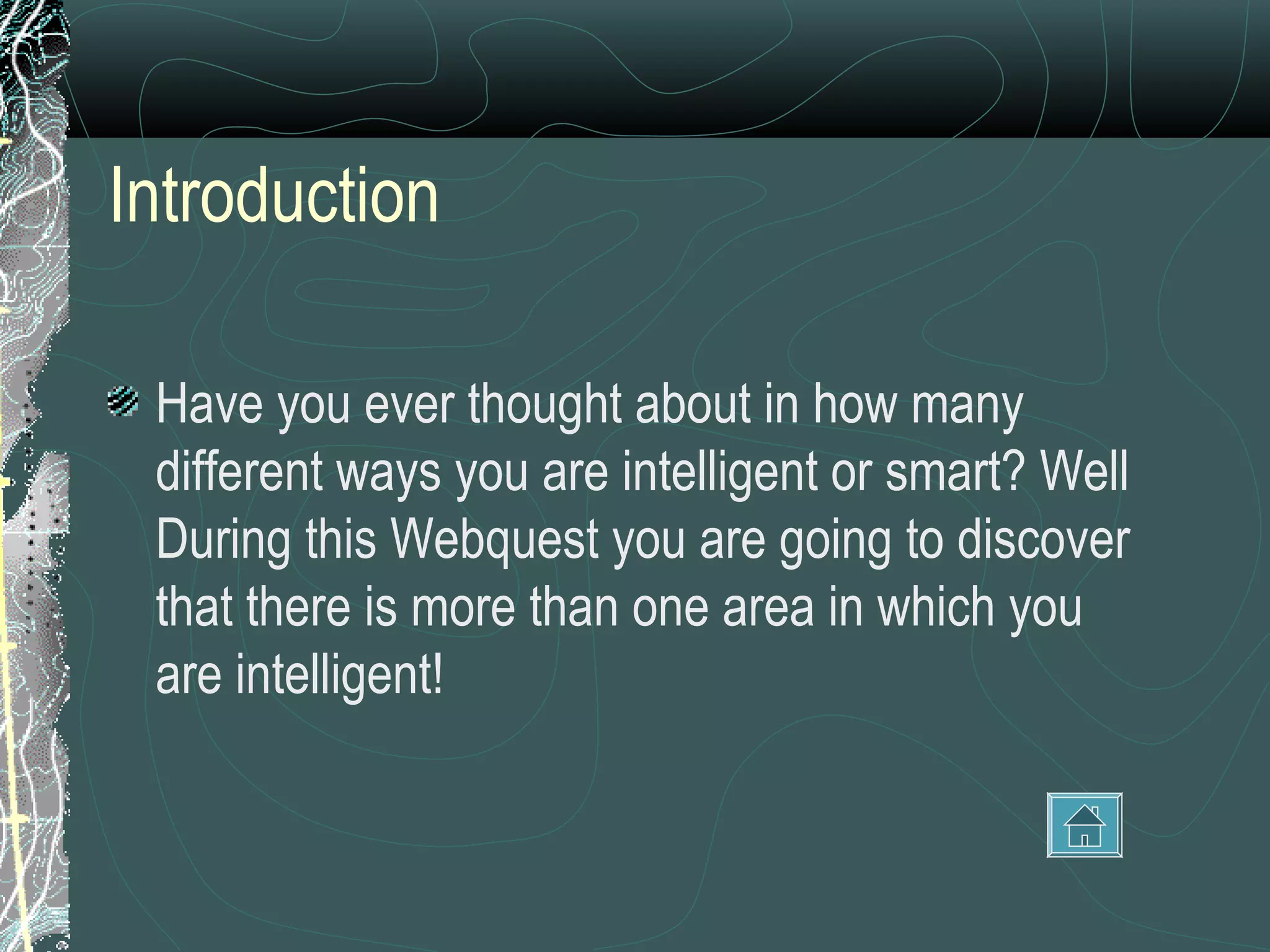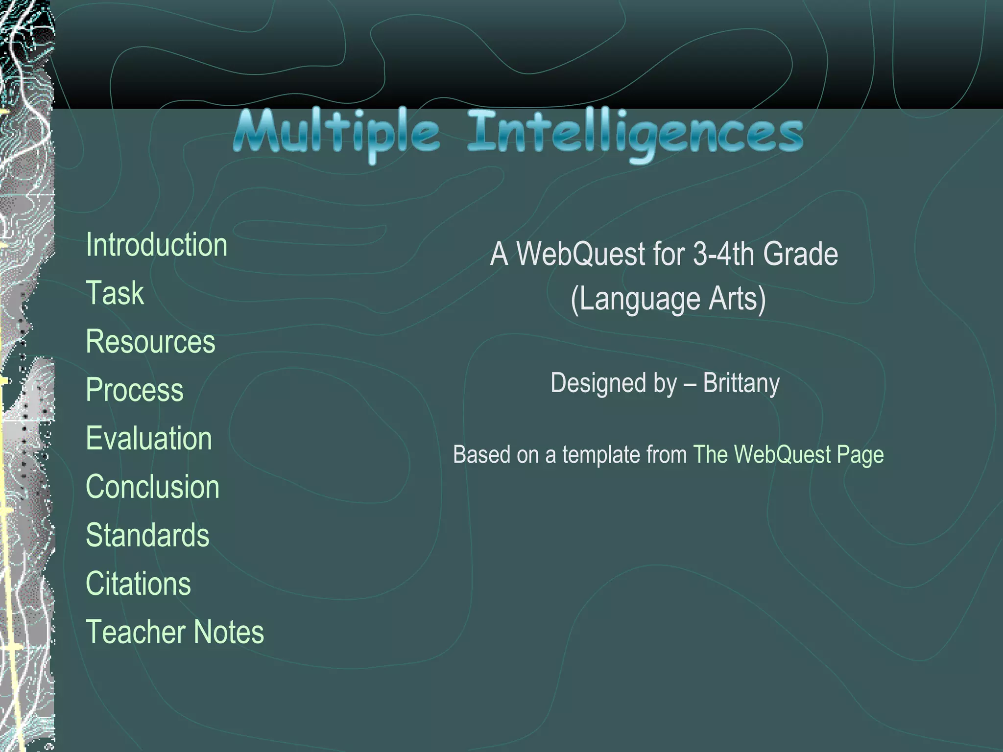 This document provides instructions for a two-day webquest on multiple intelligences for 3rd and 4th grade students. On the first day, students will take an online test to determine their top three multiple intelligences and research what those intelligences are. On the second day, students will work in groups of three to create a Venn diagram comparing their results. Each student's understanding will be evaluated using a rubric. The goal is to help students recognize their various types of intelligence.