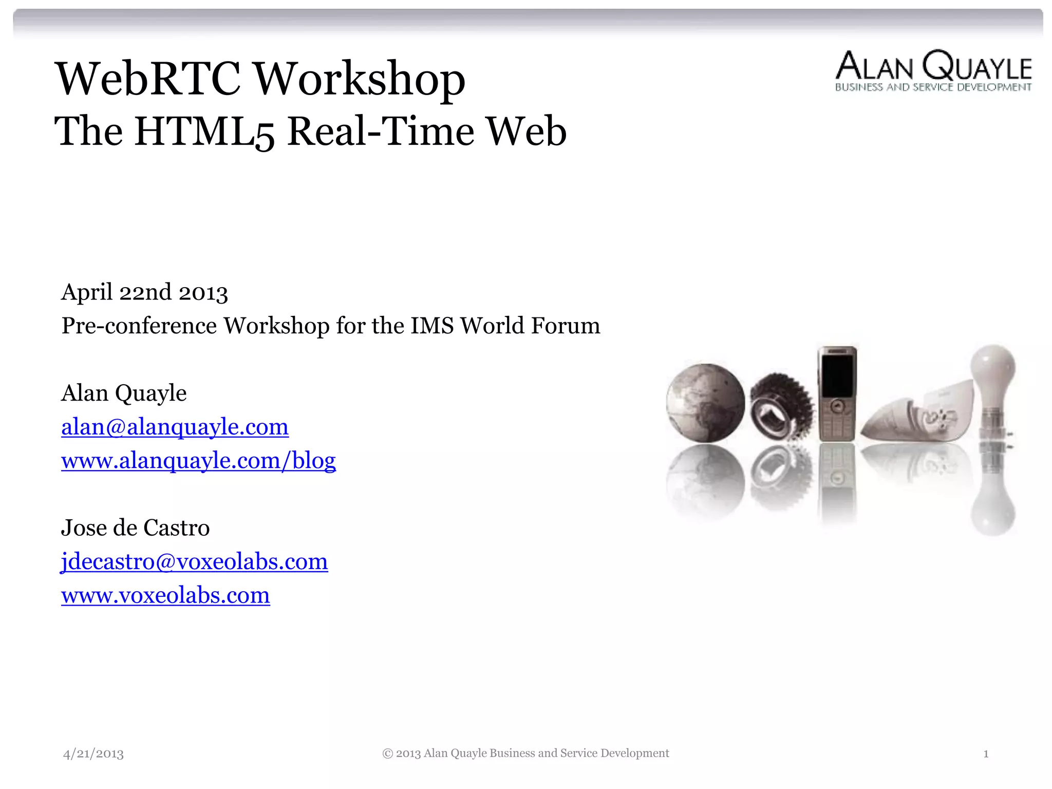 - The workshop will provide a deep technical and business overview of WebRTC through presentations and demonstrations.