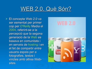 WEB 2.0. QuèSón? El concepte Web 2.0 va ser esmentat per primer cop per O'Reilly Media el 2004 , referint-se a la percepció que la segona generació de la Web es basava en comunitats i en serveis de hosting i en el fet de compartir entre usuaris espais per a fotografies, textos i vincles amb altres Web-sites.
