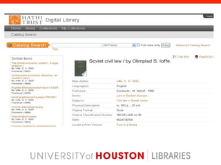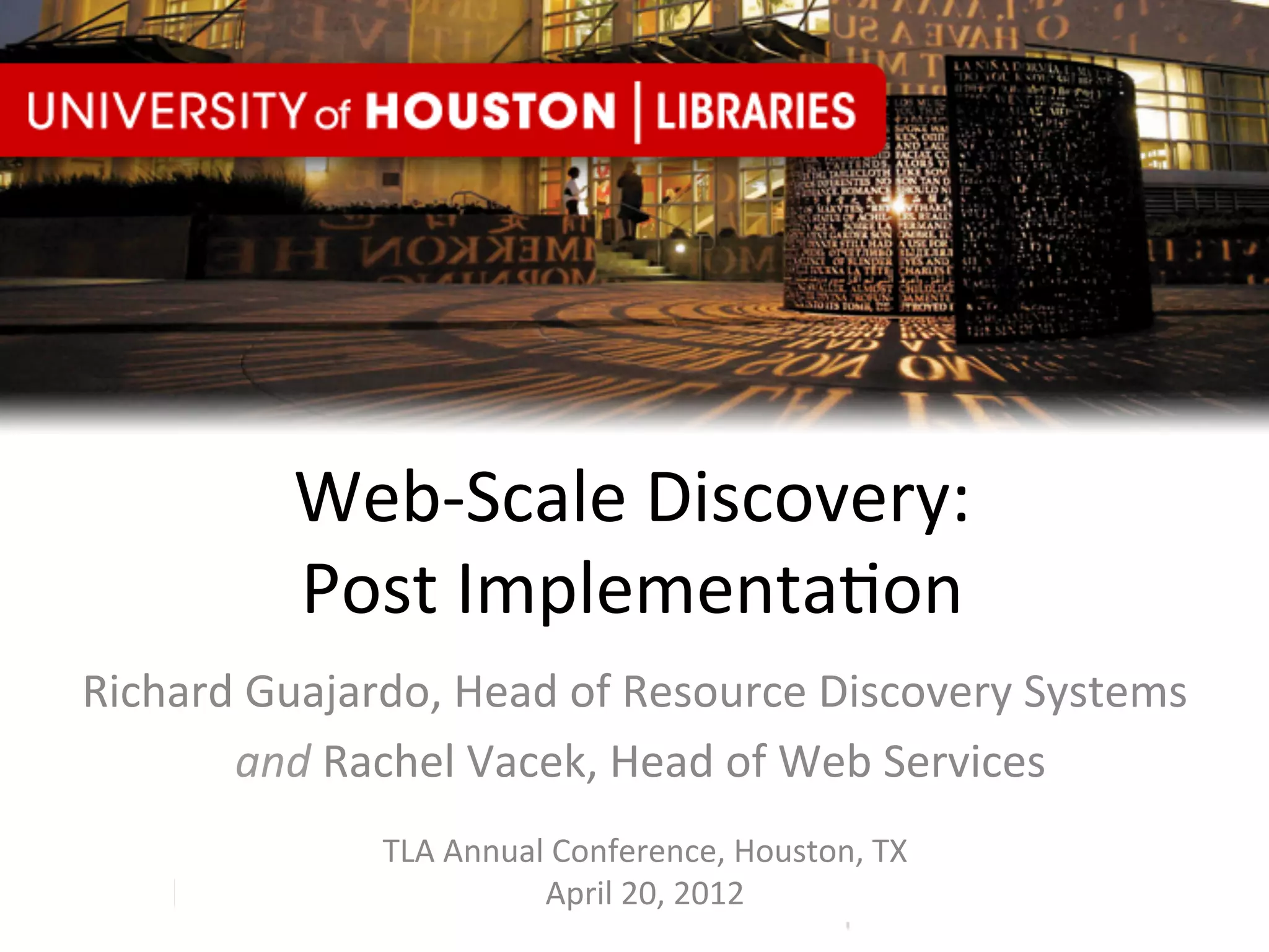 The document discusses the implementation and benefits of the Summon discovery service at a library, which provides a unified search interface for diverse content types, significantly enhancing access to research materials. User feedback indicates improved search capability and satisfaction, particularly among undergraduates, though faculty have mixed reactions due to overwhelming results. Future plans include continued assessment, market analysis, and enhancements to usability and content integration.