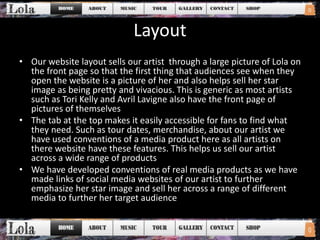 Our media product uses and develops conventions of real artist websites and merchandise. The website layout prominently features the artist with a large picture and easy navigation tabs. It also links to the artist's social media pages to further promote her image across different media. The font, colors, and central positioning of the artist's photo are designed to match her punk/youthful persona and attract a young, female audience, similar to artists like Pink and Ke$ha. The black and pink merchandise aims to appeal to this target demographic and emphasizes the artist's punk and feminine qualities through designs incorporating crowns, slogans, and glow accessories that can be used to promote her tours. Selling personalized shoes additionally reaches a younger audience, developing new