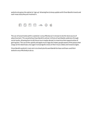 CleanBandit's website effectively promotes their music and brand. It displays one of their music videos as the main image to give visitors a sense of their music style. This helps increase their large fan base. The website provides information about the band like tour dates and news to keep fans updated. It also allows fans to stream and download their songs from services like Spotify and Apple Music. The clear goal is to use the website to continue building a worldwide fan base, and it seems well designed to achieve this aim.
