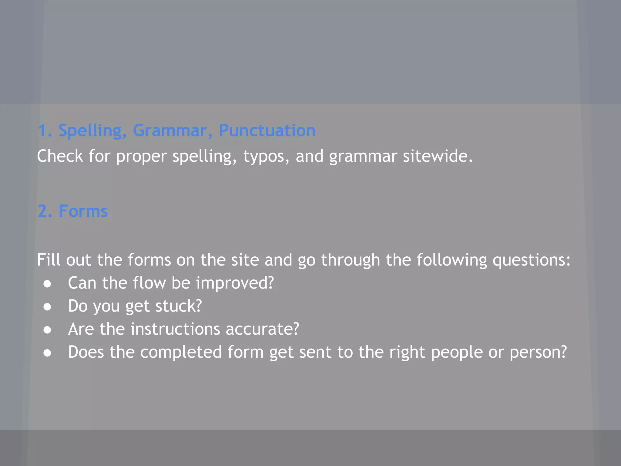 1) Checking for spelling, grammar, and punctuation errors site-wide.