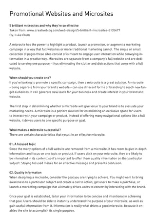 This document contains summaries of several promotional microsites for various companies. Some of the microsites discussed include: