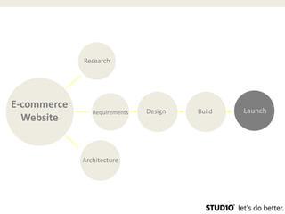 This document outlines the planning process for developing an e-commerce website. It discusses researching industry trends, target audiences, competitors and technical requirements. Different sections cover developing the site architecture, navigation structure, content and functionality. The planning process involves requirements gathering, design, building and launching the website.