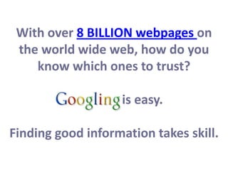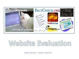 The document provides guidance on evaluating websites for research purposes. It discusses checking the domain name to determine the sponsor's reliability. Key questions to consider include the 5 Ws: who wrote it, what is the purpose/content, when was it created/updated, where did the information come from, and why should it be trusted. Additionally, the appearance and functionality of the site should be examined to ensure it is professional, loads quickly, and is easy to navigate. The example shows a student evaluating two dragonfly websites, determining that the .edu site "Dragonflies of Kentucky" would be best for a research project due to more complete information and affiliation with an educational institution.