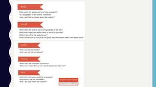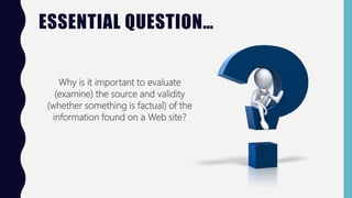This document provides guidance on evaluating the validity and reliability of information found on websites. It discusses why it is important to carefully examine the source and accuracy of online information. Key factors to consider include the author's credentials, date of publication, purpose of the site, potential biases, and whether other reliable sources corroborate the information. Students are given examples of trustworthy and questionable websites and instructed to practice evaluating sites using a rubric. The goal is to help students think critically about online content and distinguish factual reporting from unreliable or misleading information.