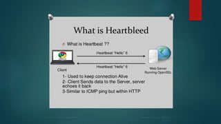 This document discusses the Heartbleed vulnerability in OpenSSL and its potential impacts. Heartbleed is a bug in the OpenSSL cryptography library that exposes the contents of the server's memory, including private keys and user session cookies. An attacker can exploit Heartbleed to steal sensitive data from vulnerable servers or impersonate services. The vulnerability had widespread implications because OpenSSL is used to secure a majority of websites. While patching servers and changing passwords addressed direct theft of information, Heartbleed also weakened the security of encrypted communications and online identities.