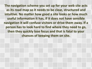 The document provides tips for designing an intuitive website navigation scheme. Effective navigation allows visitors to immediately understand where they are on the site, what content is available, and where they can go next. It recommends using consistent navigation across all pages, prioritizing text links over images, keeping navigation elements close together, and placing important links and indexes on the right side for easier visibility and clicking. Proper navigation is important for both visitors and search engines to understand the site structure and content.