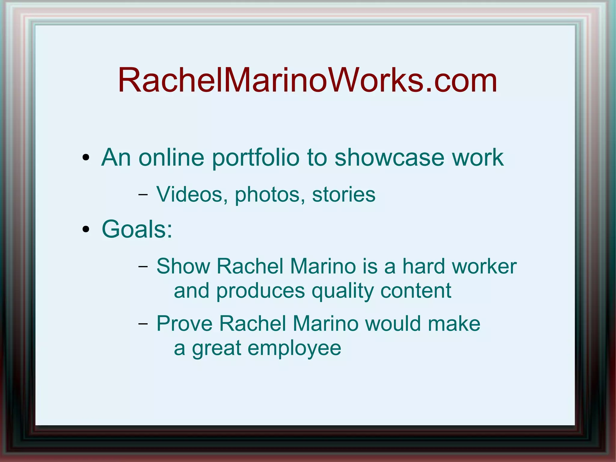 RachelMarinoWorks.com is an online portfolio website created by Rachel Marino to showcase her work through videos, photos, and stories with the goals of demonstrating that she is a hard worker who produces quality content and would make a great employee. The website content includes internship, school, and personal videos, stories, photos, and an interactive resume and 'About' section, and aims to attract potential employers as visitors along with friends, family, news junkies, and Austinities.