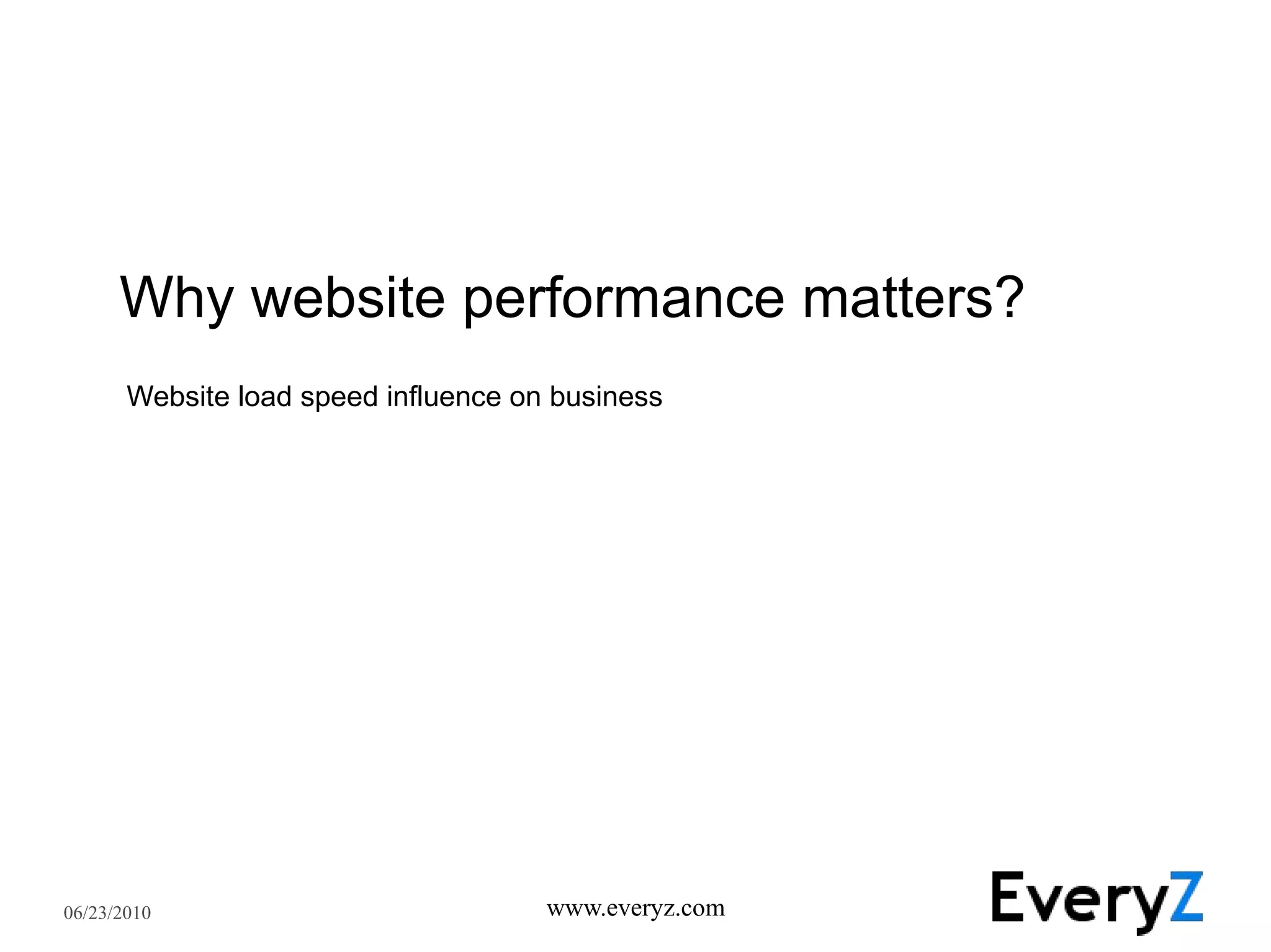 Website performance significantly impacts business metrics. Slow load times negatively influence user behavior - 47% of users expect pages to load within 2 seconds and 40% will abandon a page if it takes over 3 seconds. If a site is slow, visitors are less likely to complete purchases or return to the site. Research shows page load delays above 200ms can lower revenue by 4% and decrease user satisfaction and repeat visits. To improve performance, companies should measure site speeds, prioritize speed in development, adopt technologies like content delivery networks, and optimize features and platforms to serve all users efficiently as traffic scales.
