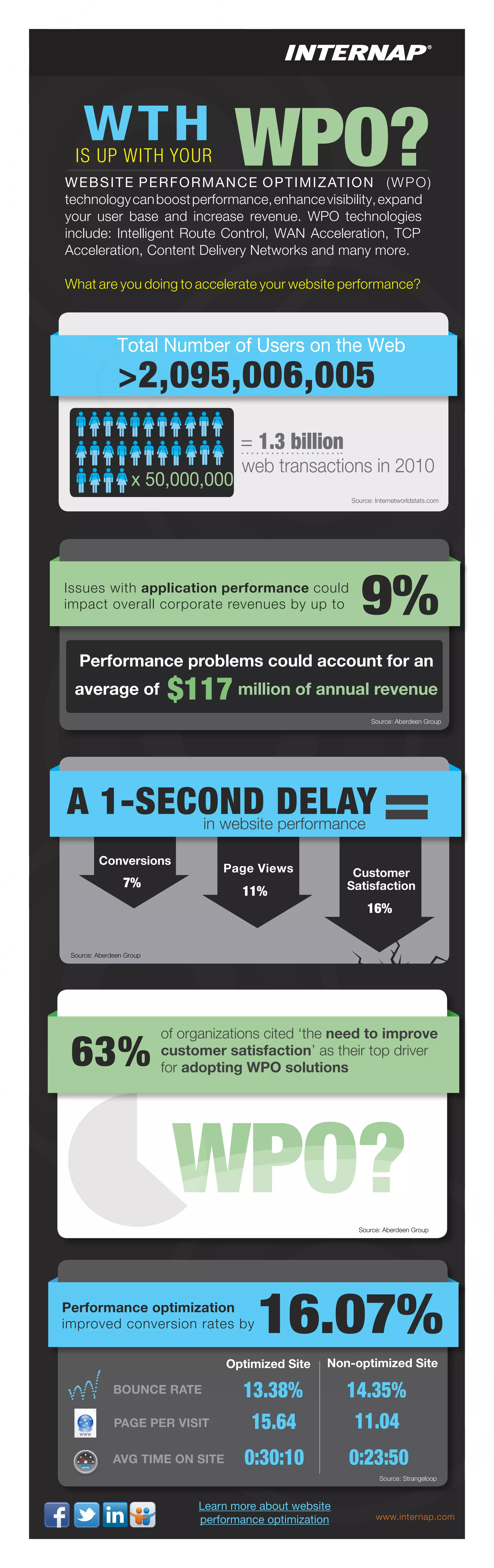 Website performance optimization (WPO) technologies such as intelligent route control and WAN acceleration can boost performance, enhance visibility, expand user bases, and increase revenue. Issues with application performance could impact corporate revenues by up to 9% and account for an average of $117 million in annual lost revenue. A 1-second delay in website performance can reduce conversion rates by 11% while WPO solutions have been shown to improve conversion rates by 16.07% and increase average time on site and pages per visit while reducing bounce rates.