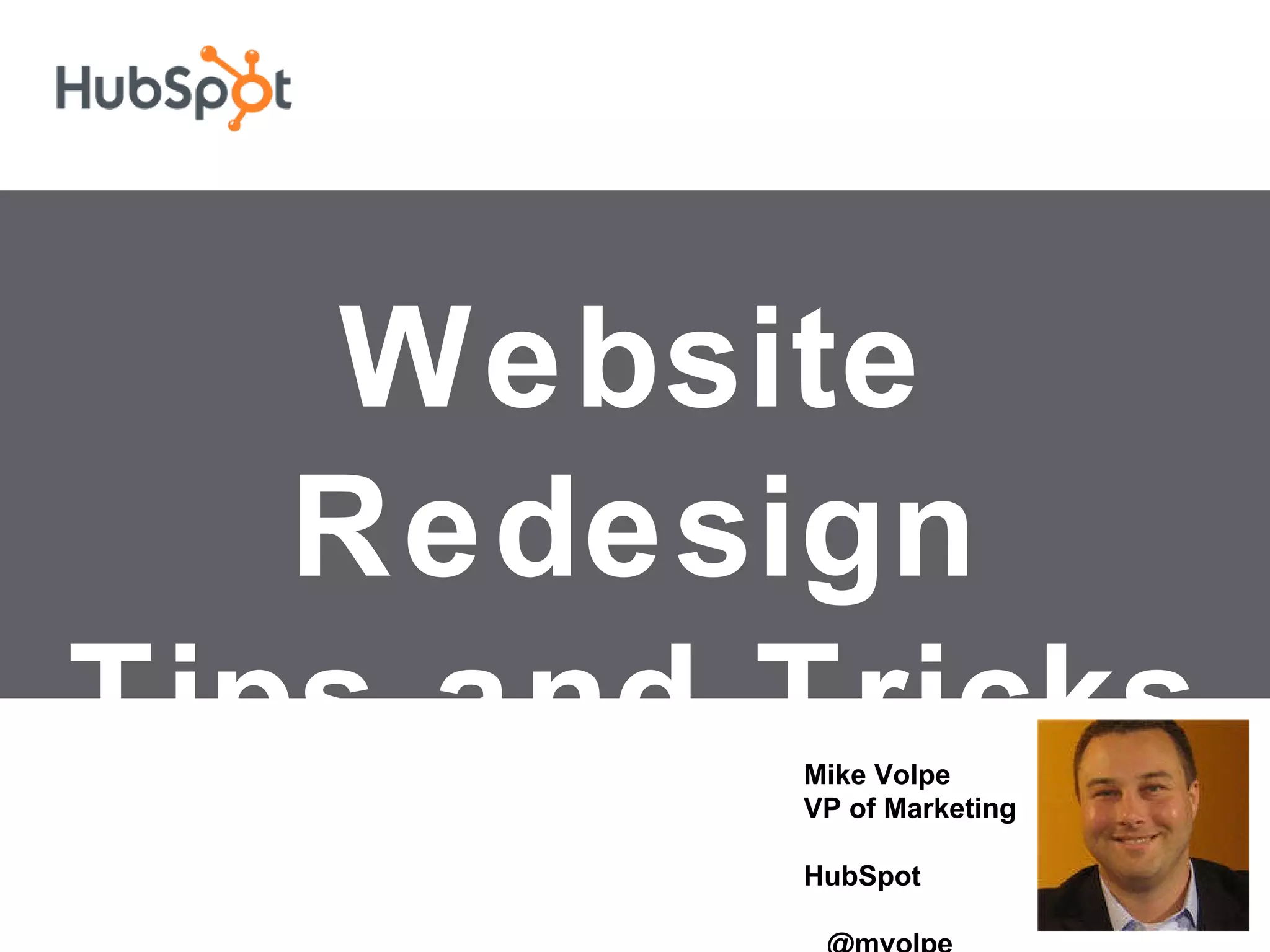 The document provides tips for successful website redesign, emphasizing the importance of attracting prospects, converting visitors into leads, and measuring return on investment (ROI). Key suggestions include auditing existing website assets, prioritizing content creation over design, and making conversion experimentation straightforward. The overall approach advocates for using inbound marketing strategies and leveraging HubSpot tools for optimization and analysis.