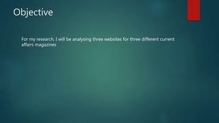 The document analyzes and compares the website structures and magazine editions of three current affairs magazines: The Big Issue, Prospect, and New Statesman. All three magazines have sections for politics and culture. The Big Issue and Prospect websites make their latest and archived issues easily accessible online and offer print and digital subscriptions. In contrast, the New Statesman website does not display covers of all its editions but provides options to view the UK or international version and receive print or digital copies.