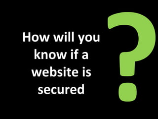 The document discusses how to determine if a website is secure and the effects of security on SEO. It provides tips for identifying security on different browsers like checking for the lock icon or noticing the URL starts with "https." An insecure site can negatively impact rankings, customer experience, and trust. While good SEO is important, ignoring security issues means all SEO efforts could be lost if the site is compromised.