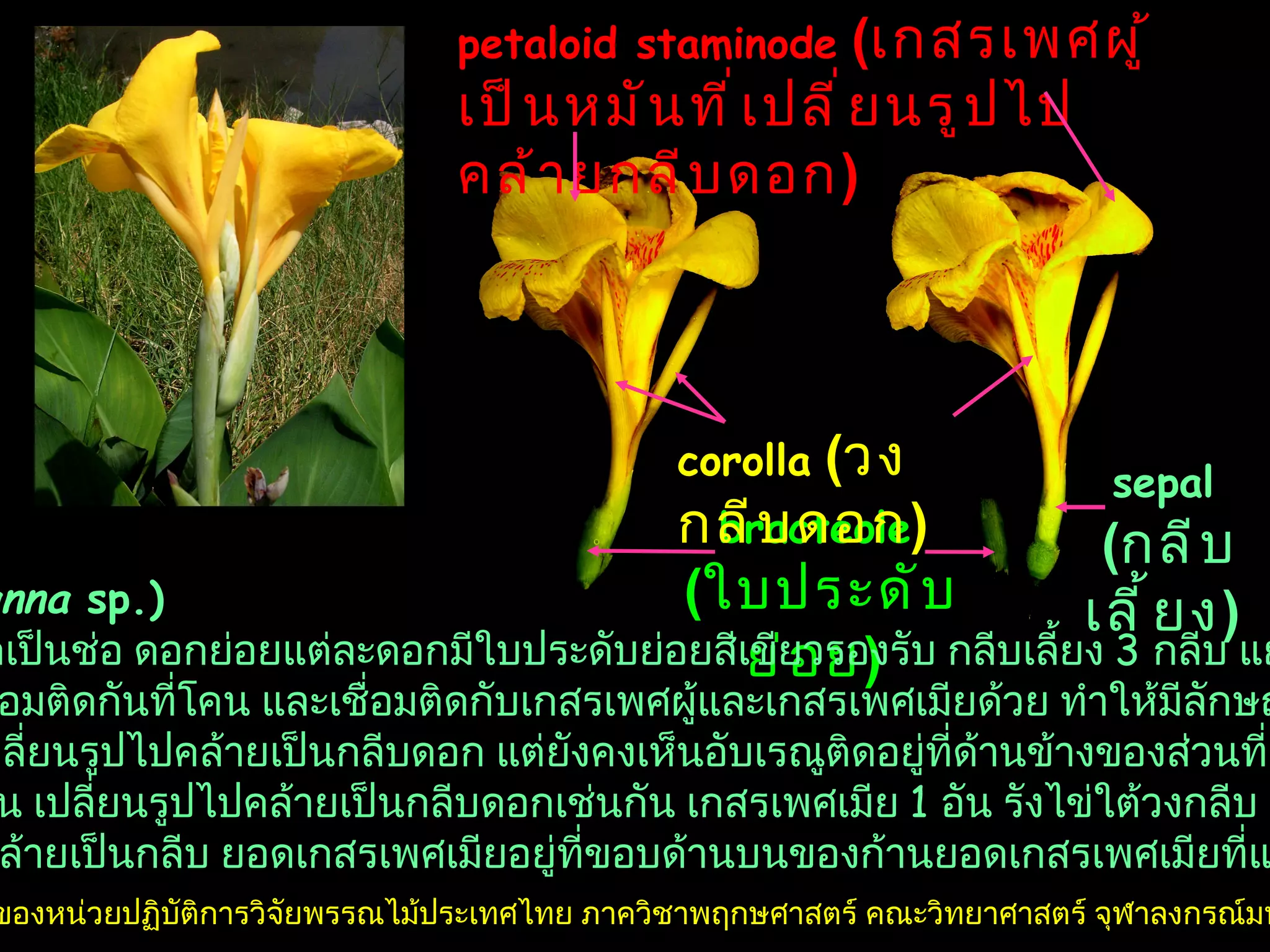 bracteole ( ใบประดับย่อย ) corolla ( วงกลีบดอก ) petaloid staminode ( เกสรเพศผู้เป็นหมันที่เปลี่ยนรูปไปคล้ายกลีบดอก ) sepal ( กลีบเลี้ยง ) พุทธรักษา ( Canna sp.) พุทธรักษาออกดอกเป็นช่อ ดอกย่อยแต่ละดอกมีใบประดับย่อยสีเขียวรองรับ กลีบเลี้ยง 3 กลีบ แยกจากกันเป็นอิสระ กลีบดอก 3 กลีบเชื่อมติดกันที่โคน และเชื่อมติดกับเกสรเพศผู้และเกสรเพศเมียด้วย ทำให้มีลักษณะคล้ายเป็นหลอด เกสรเพศผู้ 1 อัน เปลี่ยนรูปไปคล้ายเป็นกลีบดอก แต่ยังคงเห็นอับเรณูติดอยู่ที่ด้านข้างของส่วนที่คล้ายเป็นกลีบ เกสร เพศผู้เป็นหมัน 4 อัน เปลี่ยนรูปไปคล้ายเป็นกลีบดอกเช่นกัน เกสรเพศเมีย 1 อัน รังไข่ใต้วงกลีบ ก้านยอดเกสรเพศ เมีย 1 อัน แผ่ออกคล้ายเป็นกลีบ ยอดเกสรเพศเมียอยู่ที่ขอบด้านบนของก้านยอดเกสรเพศเมียที่แผ่ออก ลิขสิทธิ์ของหน่วยปฏิบัติการวิจัยพรรณไม้ประเทศไทย ภาควิชาพฤกษศาสตร์ คณะวิทยาศาสตร์ จุฬาลงกรณ์มหาวิทยาลัย - 2.
