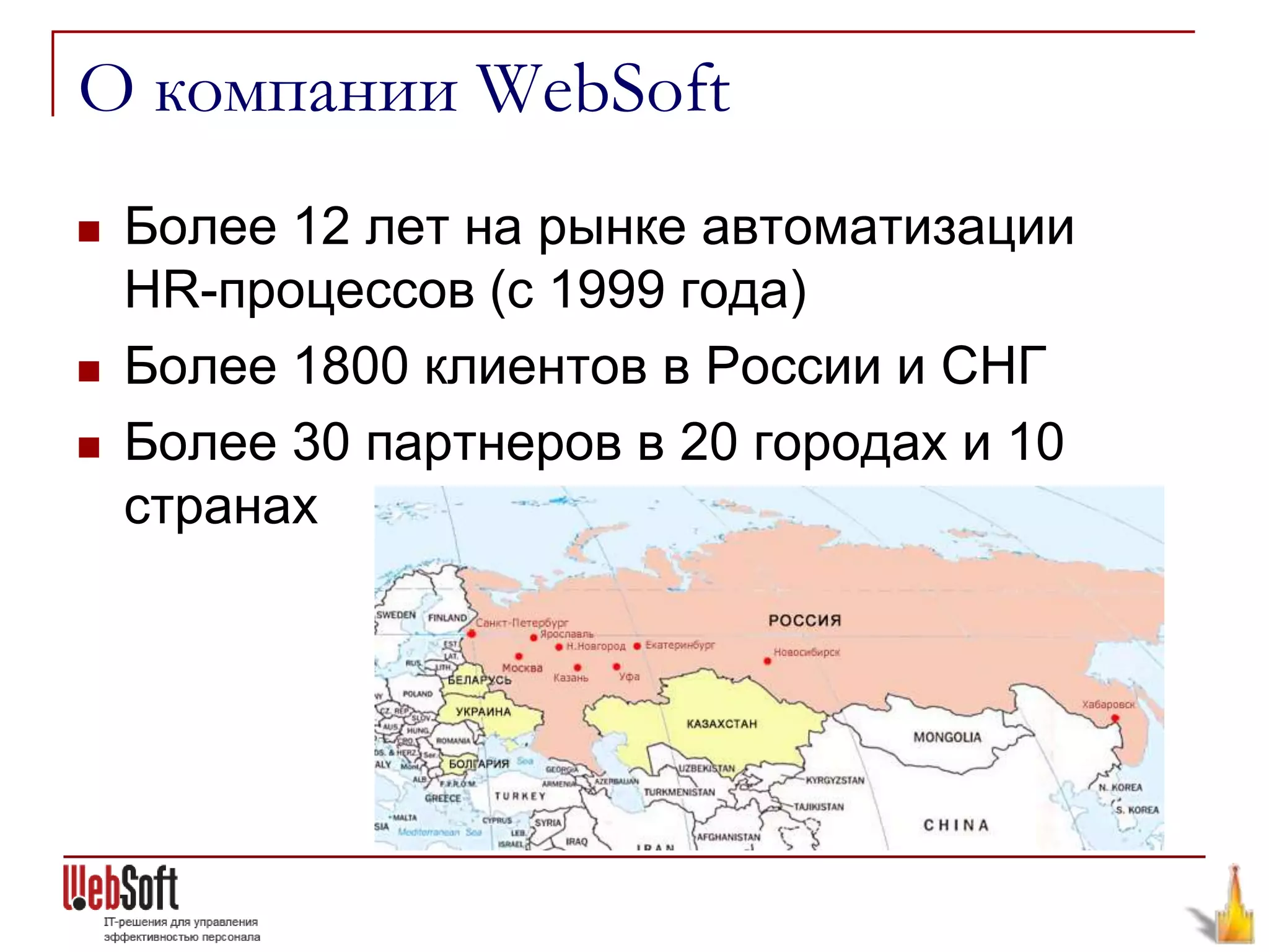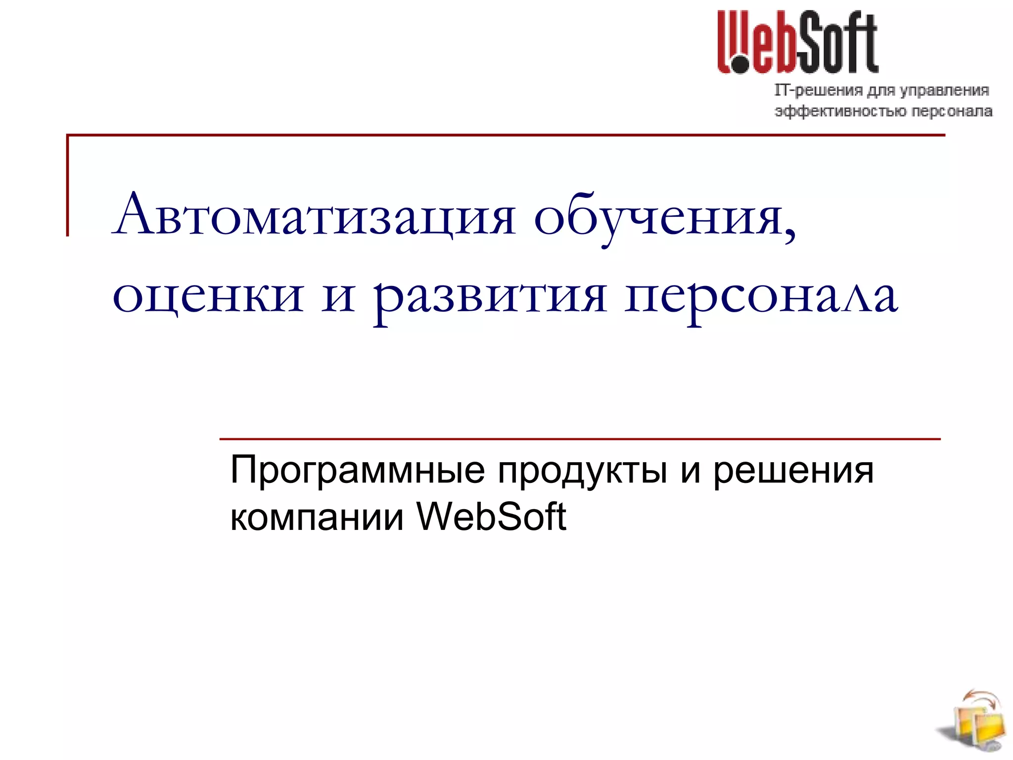 Документ описывает программные продукты и решения компании Websoft, специализирующейся на автоматизации HR-процессов, e-learning и развитии персонала. С более чем 12-летним опытом и более 1800 клиентами, компания предлагает инструменты для дистанционного обучения, оценки знаний и управления карьерой, включая систему WebTutor и редактор электронных курсов CourseLab. Основные преимущества продуктов Websoft включают сокращение затрат на обучение, ускорение учебных процессов и гибкую автоматизацию оценки персонала.