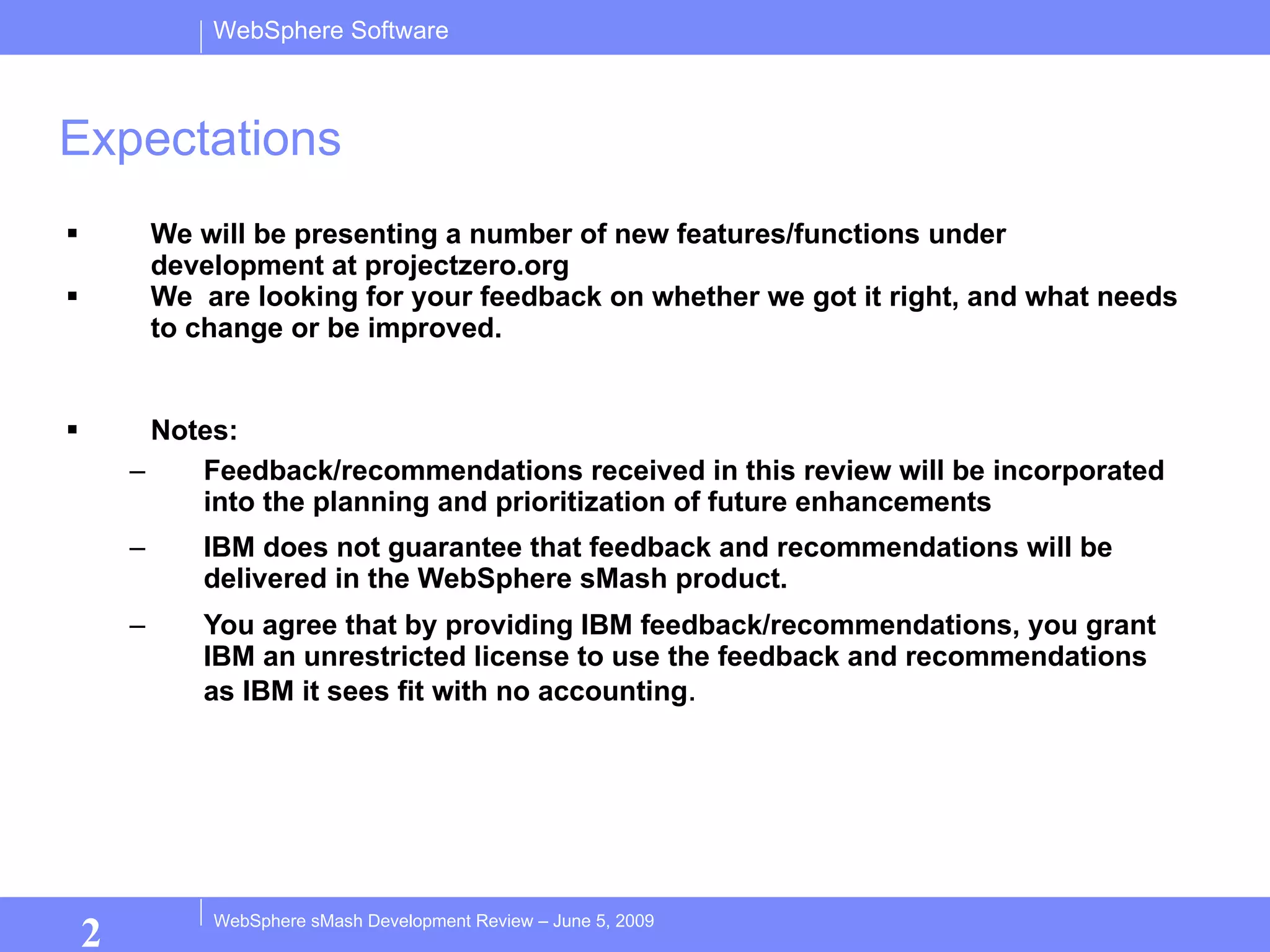 The document provides an overview of new features and functions under development for the WebSphere sMash/Project Zero platform, including:
