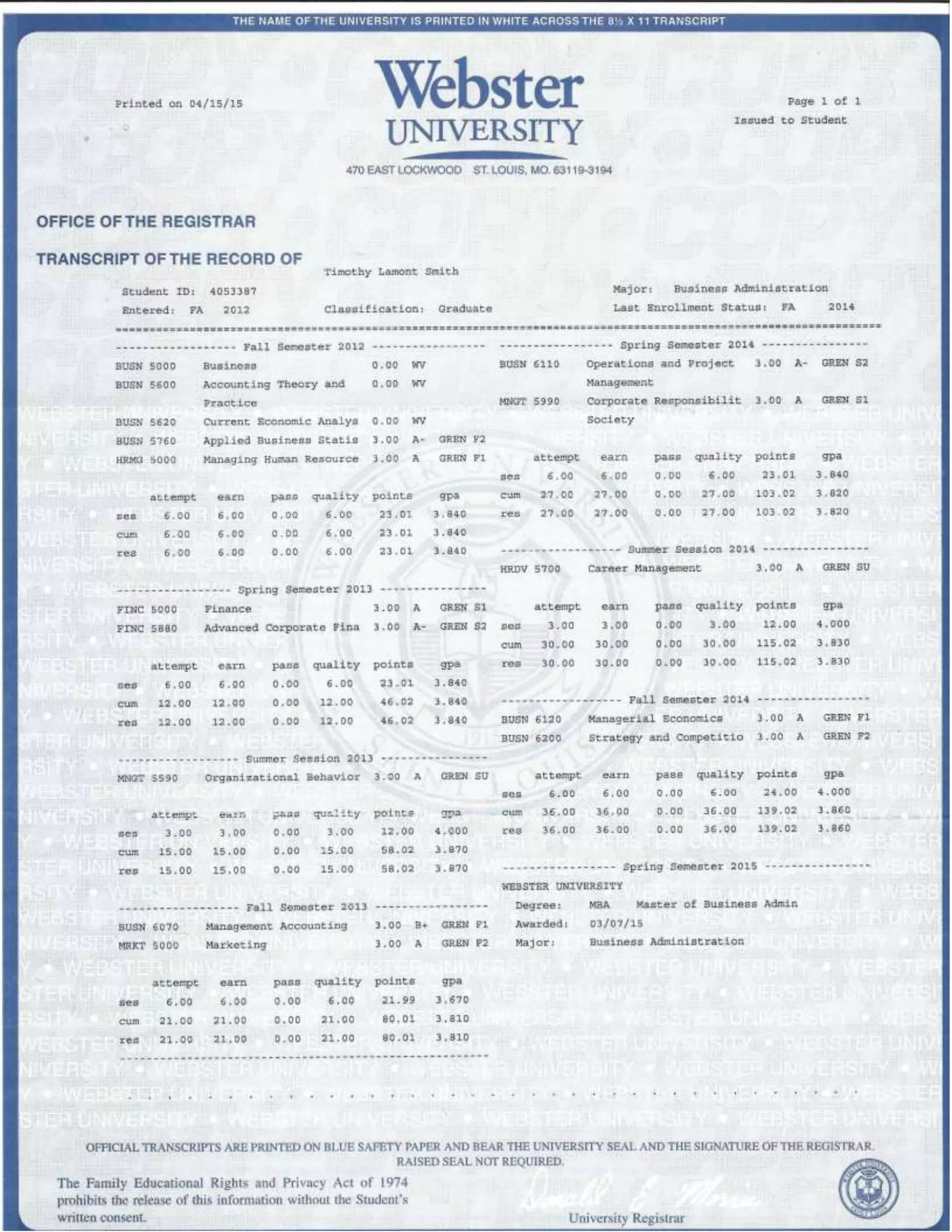 College Transcript MBA and MA PDF