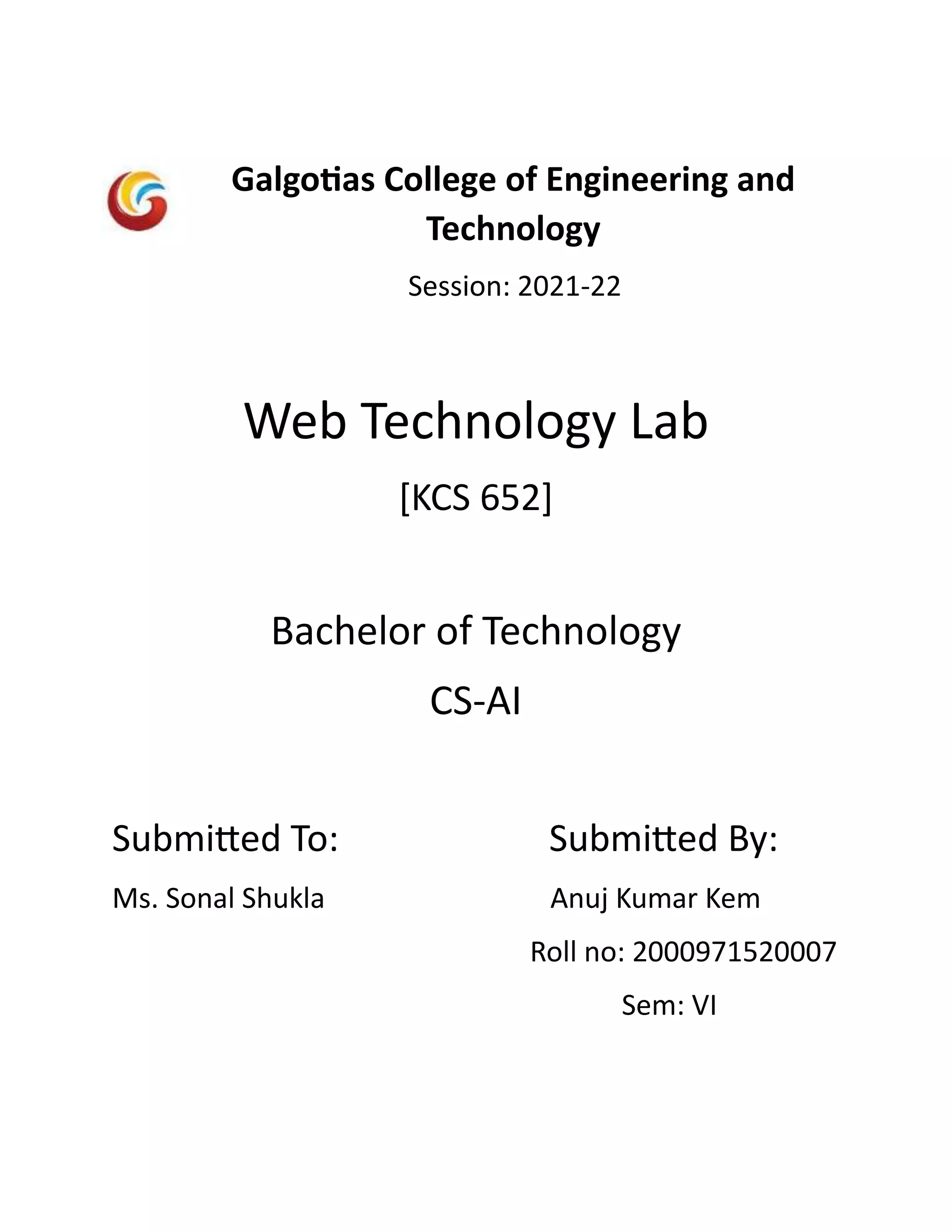 The document outlines programs completed for a Web Technology lab, including writing HTML and JavaScript to display a CV on different websites, designing a student registration form, using JavaScript to display browser information, and creating a Java applet to display an application like a calculator. It provides the objectives, theory, code, and output for each program completed as part of the lab assignment.