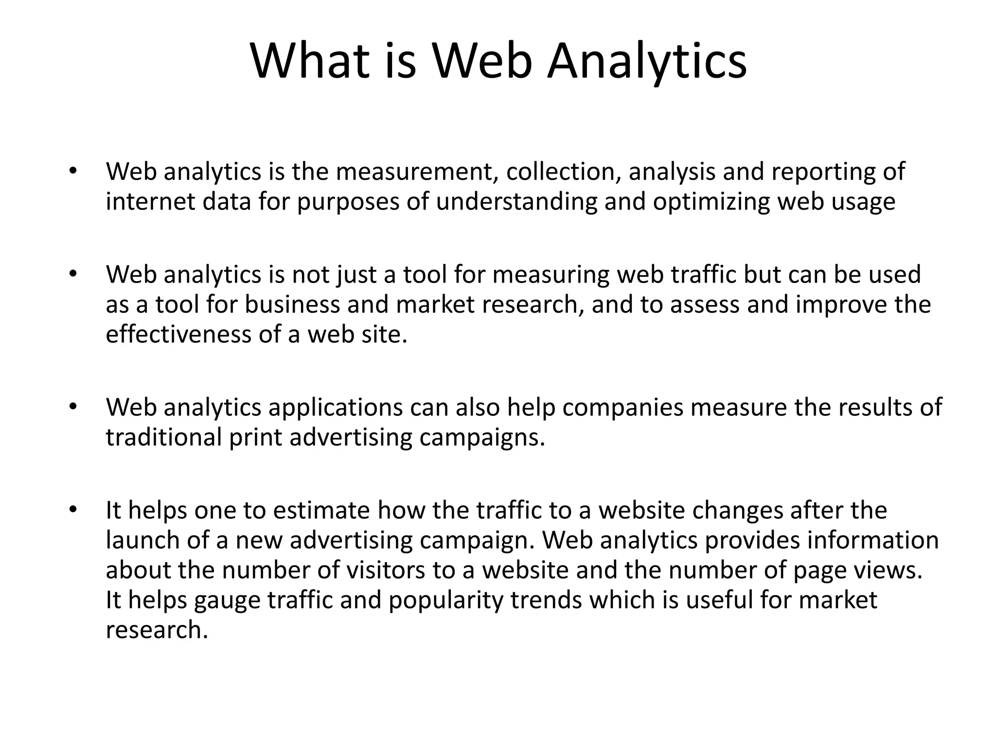 Web analytics is the measurement and analysis of internet data to understand and optimize website usage. It provides information on traffic, page views, and popularity trends which is useful for market research and assessing advertising campaigns. Web analytics tools can measure return on investment, identify top referral sources, optimize conversions, and save on customer support costs. Popular free and paid tools include Google Analytics, Compete, Quantcast, StatCounter, WebTrends, ClickTale, and Crazyegg which provide metrics on traffic, user behavior, and usability.