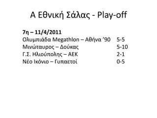 Σάλας - Play-off7η – 11/4/2011Ολυμπιάδα Megathlon – Αθήνα ’90 5-5Μινώταυρος – Δούκας 5-10Γ.Σ. Ηλιούπολης – ΑΕΚ 2-1Νέο Ικόνιο – Γυπαετοί0-5
