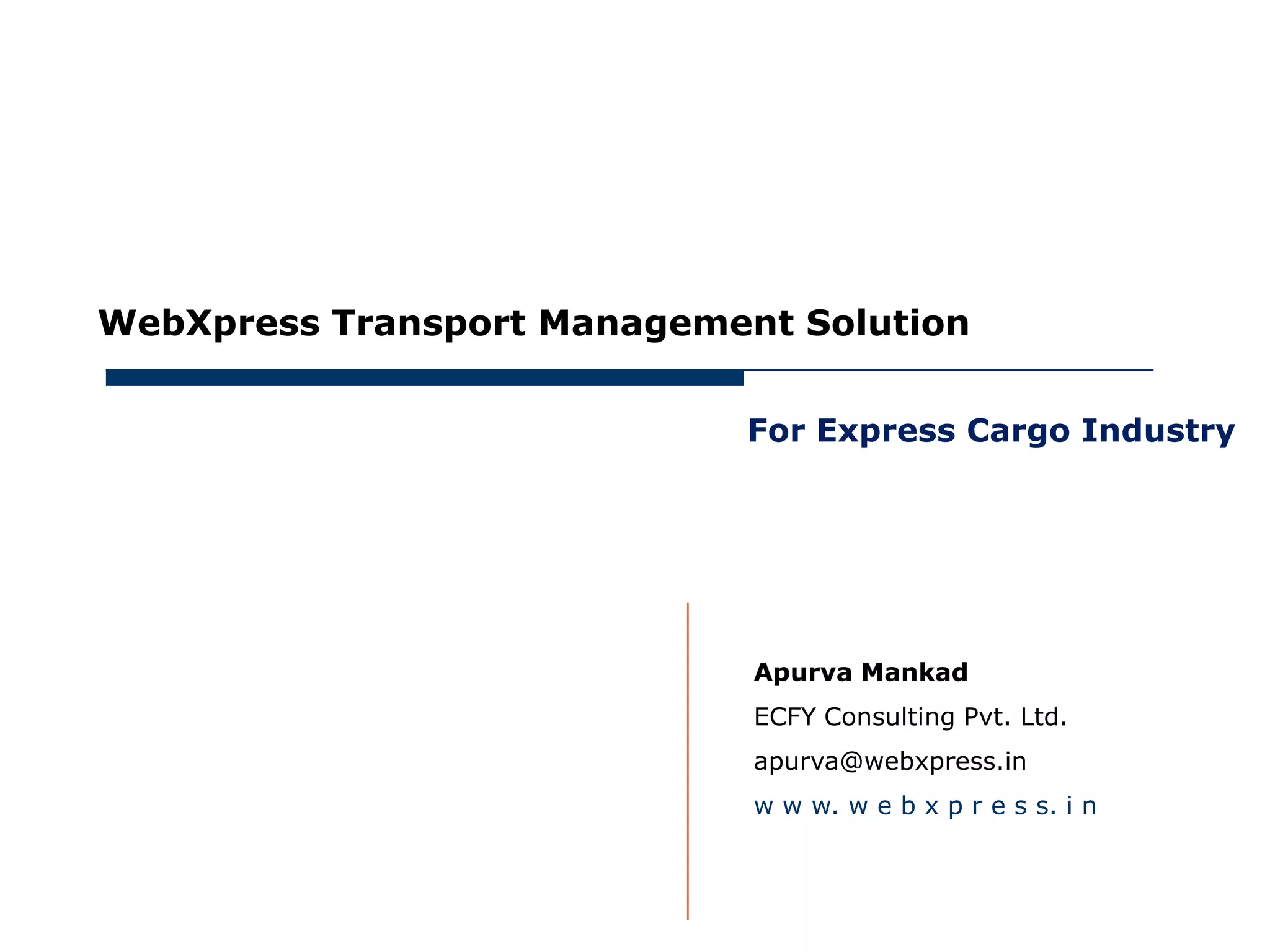This document describes WebXpress's transportation management solution for the express cargo industry. It provides an overview of WebXpress's mobile applications that allow users to perform functions like booking consignments, updating delivery information, and scanning PODs from mobile devices. The applications are integrated with WebXpress's TMS, FMS, and WMS products and allow customers to digitize their transportation operations using Android and Windows mobile devices.