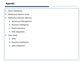 The document provides information on WebXpress's warehouse management system (WMS) solution. It discusses WebXpress's WMS modules, features, implementation process, and technical infrastructure. It also presents a case study of WebXpress's B2B data integration with Saregama India, describing how data is automatically exchanged between Saregama's SAP system and WebXpress's WMS using a proprietary data bridge.