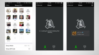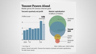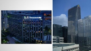 Tencent is a Chinese technology company founded in 1998 that created the popular messaging apps QQ and WeChat. QQ launched in 1998 and now has over 2 billion users, while WeChat launched in 2011 and offers text, voice, and other features. Tencent has experienced significant growth, reporting $3.15 billion in profit in 2013. WeChat's mobile games are also a major source of profit, generating over $424 million in the last quarter of 2014. During the recent Lunar New Year holiday, over 200 million WeChat users participated in exchanging "red packets" or lucky money, sending over 6 billion yuan worth of digital gifts. Tencent prides itself on prioritizing customers, employees, society, and then
