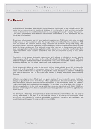 YouCreate is a collaborative software development platform that allows teams to develop web applications together. It uses a visual flowcharting approach to code development that does not require technical knowledge. The platform stores all project elements in a central repository and allows different users, such as designers, developers and project managers, to collaborate simultaneously. Code generators then translate the visual code into code for different platforms like Java and C++.