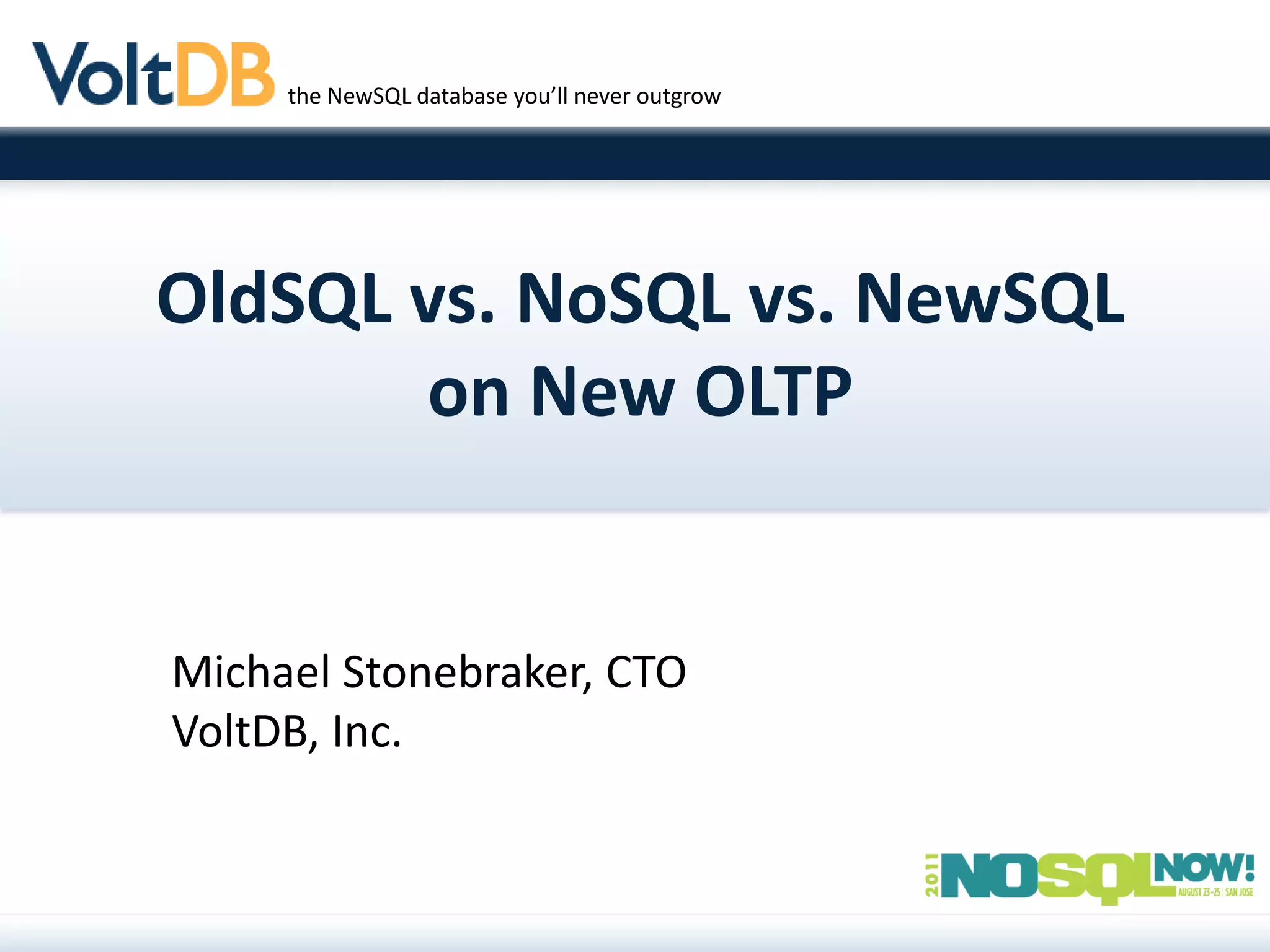 The document discusses the evolution of online transaction processing (OLTP) databases and introduces NewSQL as a solution. It notes that traditional OLTP (OldSQL) is too slow and does not scale for modern high-volume applications (New OLTP). NoSQL databases provide performance but lack consistency guarantees and a SQL interface. NewSQL databases preserve SQL and consistency while providing the performance and scalability needed for New OLTP through innovative architectures. VoltDB is provided as an example NewSQL database that is over 45x faster than traditional OLTP databases and scales to over 1.6 million transactions per second.