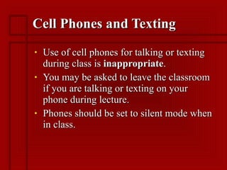 This document outlines the policies and expectations for an academic geography course. It discusses cheating and plagiarism, cell phone use, use of the Blackboard online platform, accommodations for disabled students, contact information for the instructor, the tentative class schedule and topics, resources for student success, an introduction to the fields of geography, and the tools and realms that will be studied.