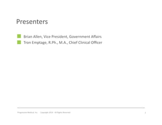 This document summarizes trends shaping workers' compensation medication policies in 2014. It discusses the influence of various factors, including political influences from the Affordable Care Act and state elections; clinical influences like an aging population and the opioid epidemic; and product influences as new medications enter the market. It also outlines debates around issues like physician dispensing, compounded medications, medical marijuana, and opioid monitoring programs.