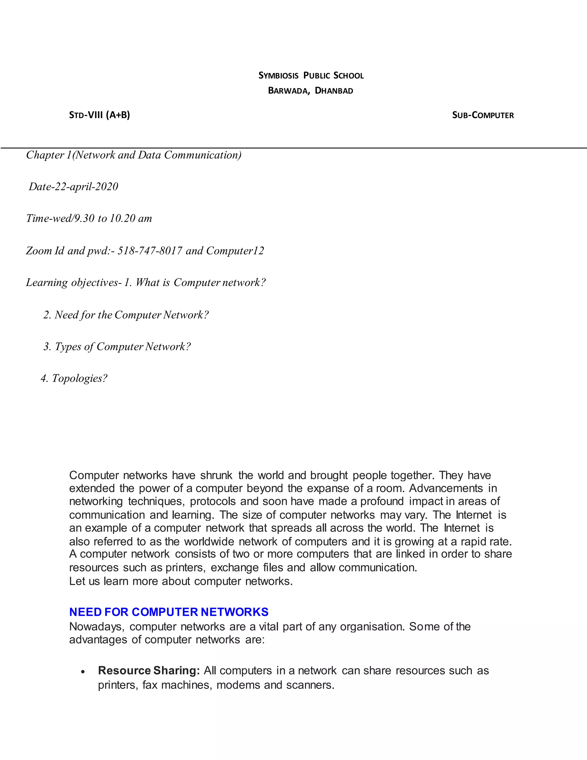 The document provides information about a computer class on networks and data communication. It discusses the learning objectives of the class which are to understand what a computer network is, the need for networks, different types of networks, and network topologies. It then defines different types of networks including personal area networks, local area networks, campus area networks, metropolitan area networks, and wide area networks. It also describes the four main network topologies of bus, ring, star, and mesh. Students are assigned questions on these topics for the next class.